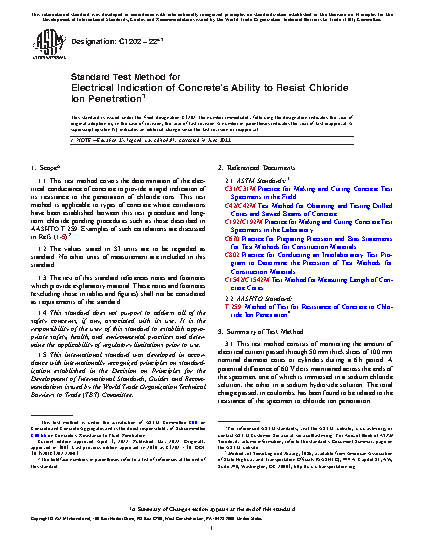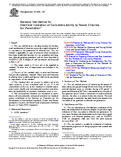1.1 This test method covers the determination of the electrical conductance of concrete to provide a rapid indication of its resistance to the penetration of chloride ions. This test method is applicable to types of concrete where correlations have been established between this test procedure and long-term chloride ponding procedures such as those described in AASHTO T 259. Examples of such correlations are discussed in Refs (1-5).2