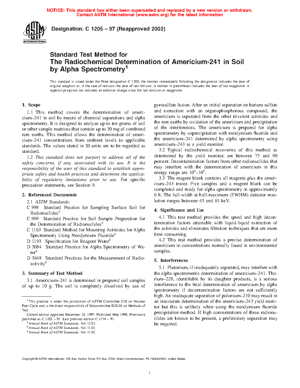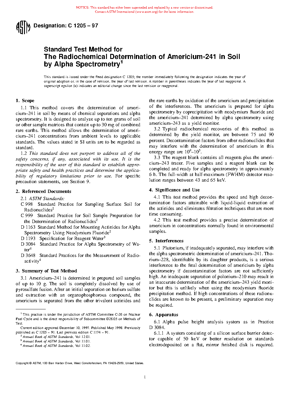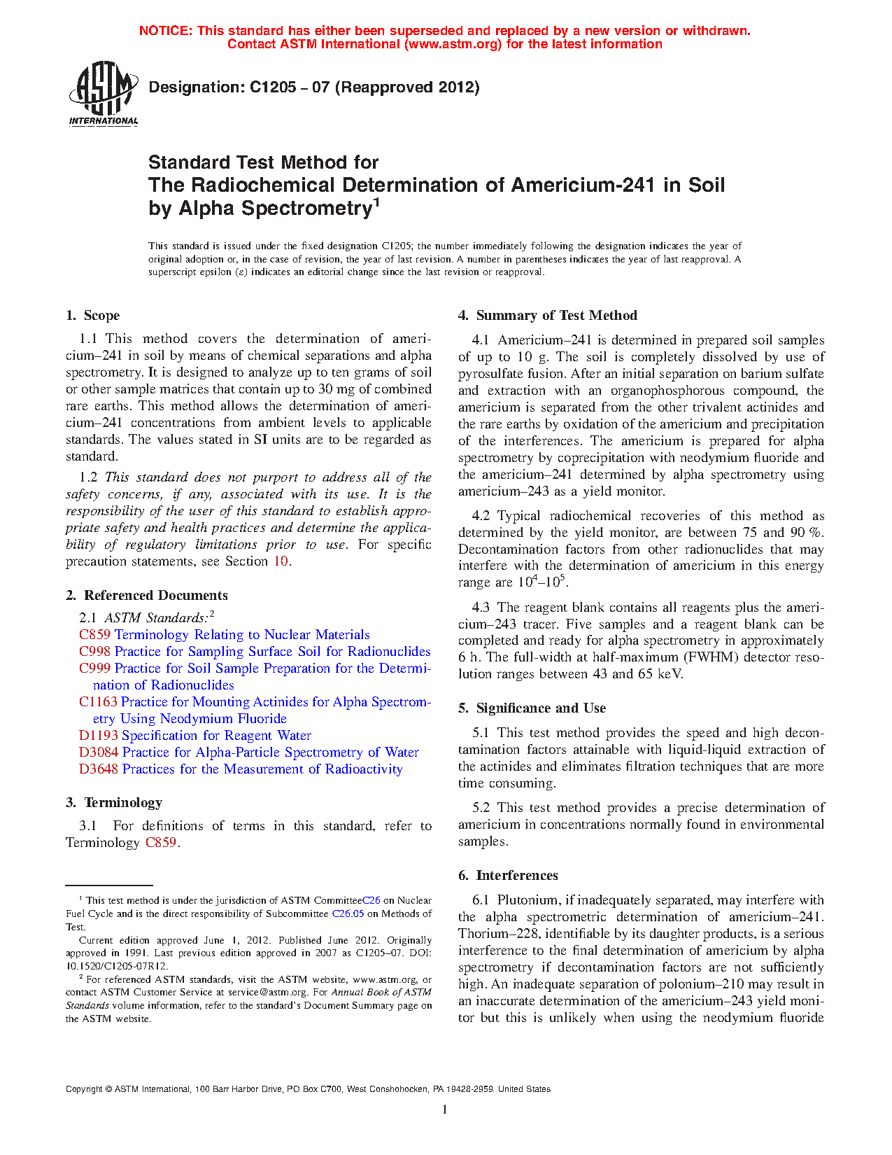 1.1 This test method covers the determination of 241Am in soil by means of chemical separations and alpha spectrometry. It is designed to analyze up to 10 g of soil or other sample matrices that contain up to 30 mg of combined rare earths. This test method allows the determination of 241Am concentrations from ambient levels to applicable standards.