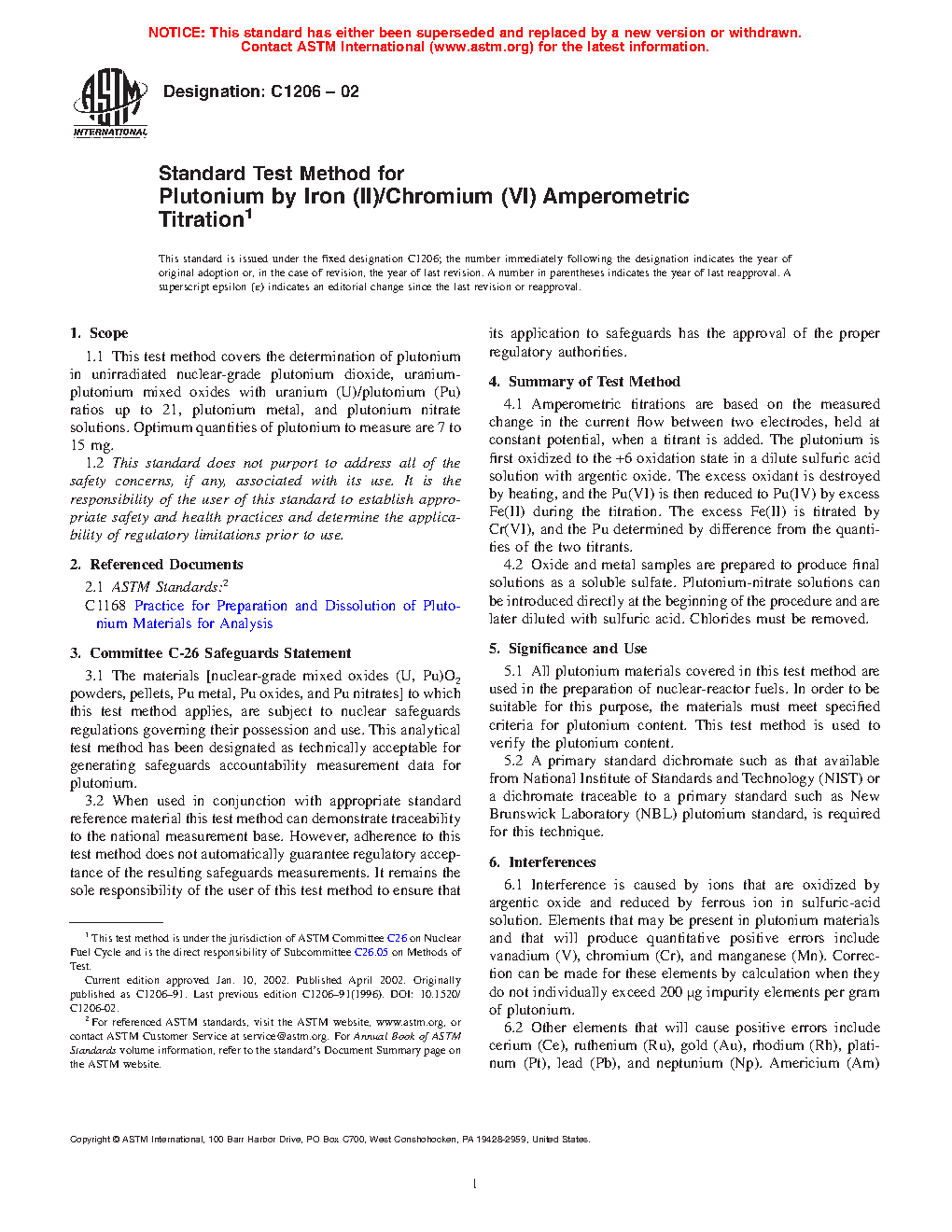 Standard Test Method for Plutonium by Iron (II)/Chromium (VI) Amperometric Titration