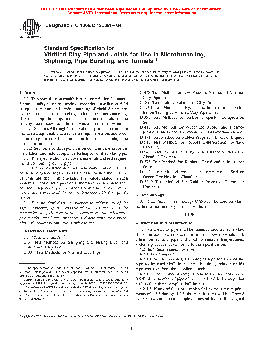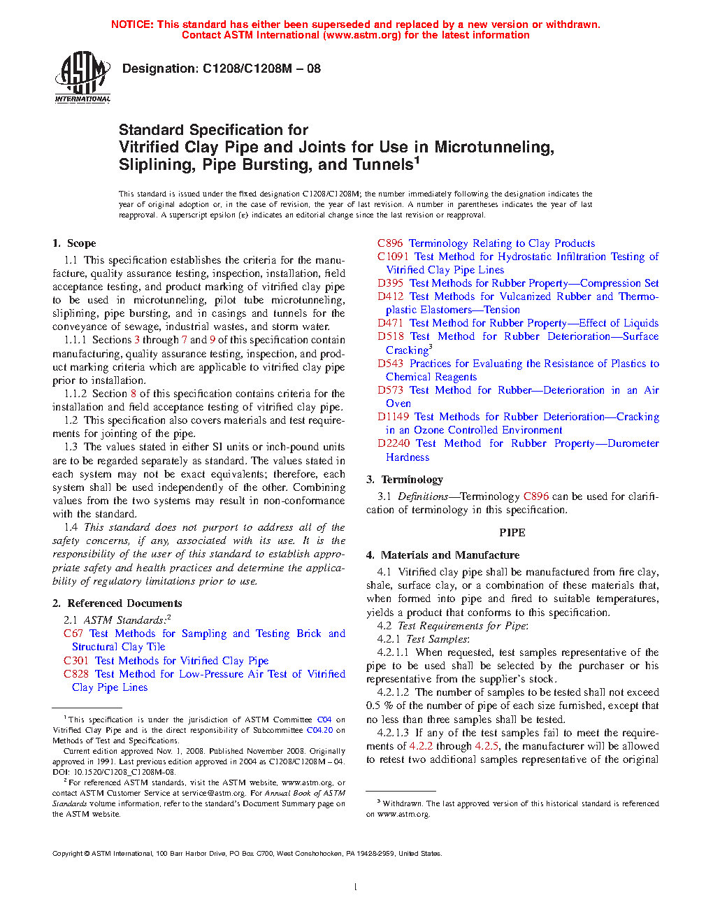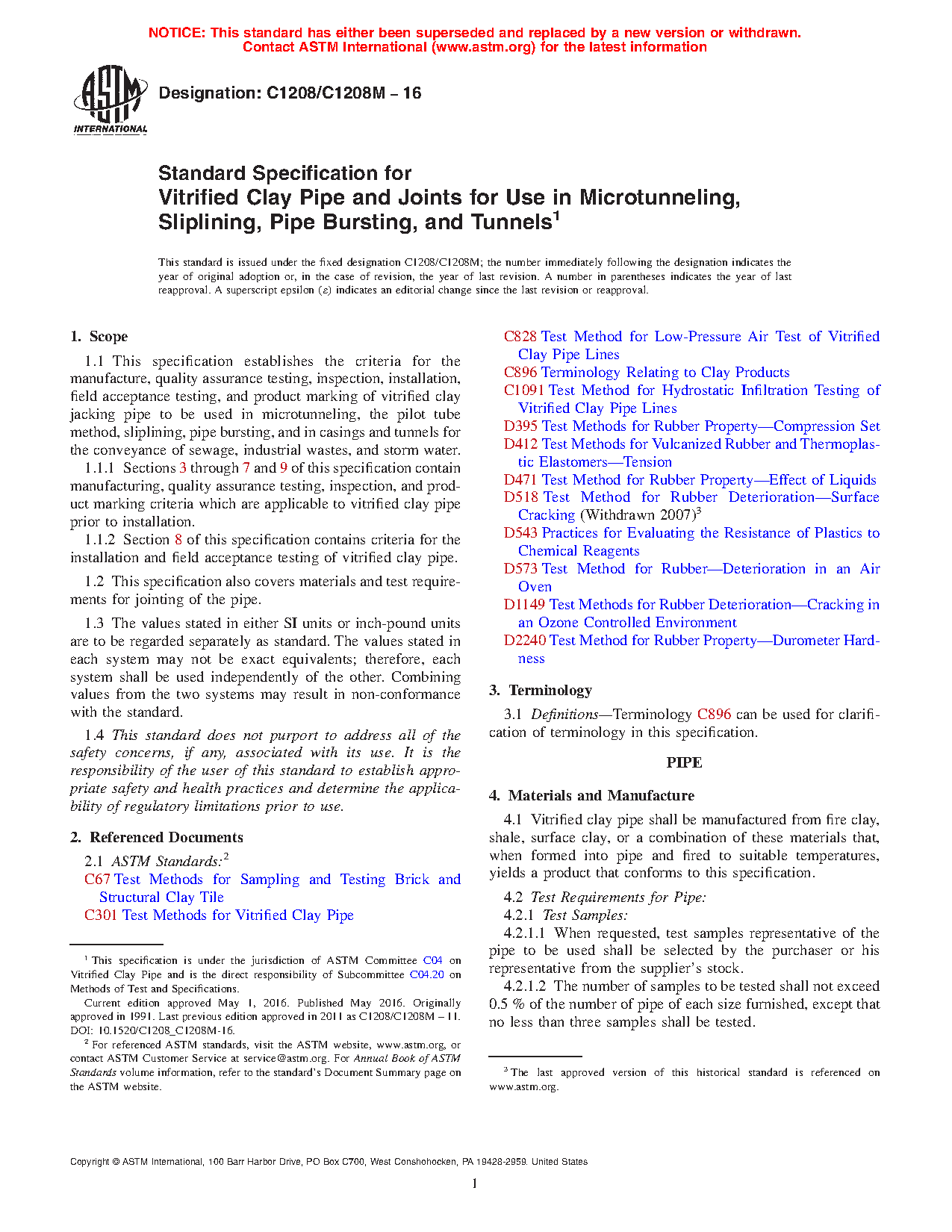 1.1 This specification establishes the criteria for the manufacture, quality assurance testing, inspection, installation, field acceptance testing, and product marking of vitrified clay jacking pipe to be used in microtunneling, the pilot tube method, sliplining, pipe bursting, and in casings and tunnels for the conveyance of sewage, industrial wastes, and storm water.