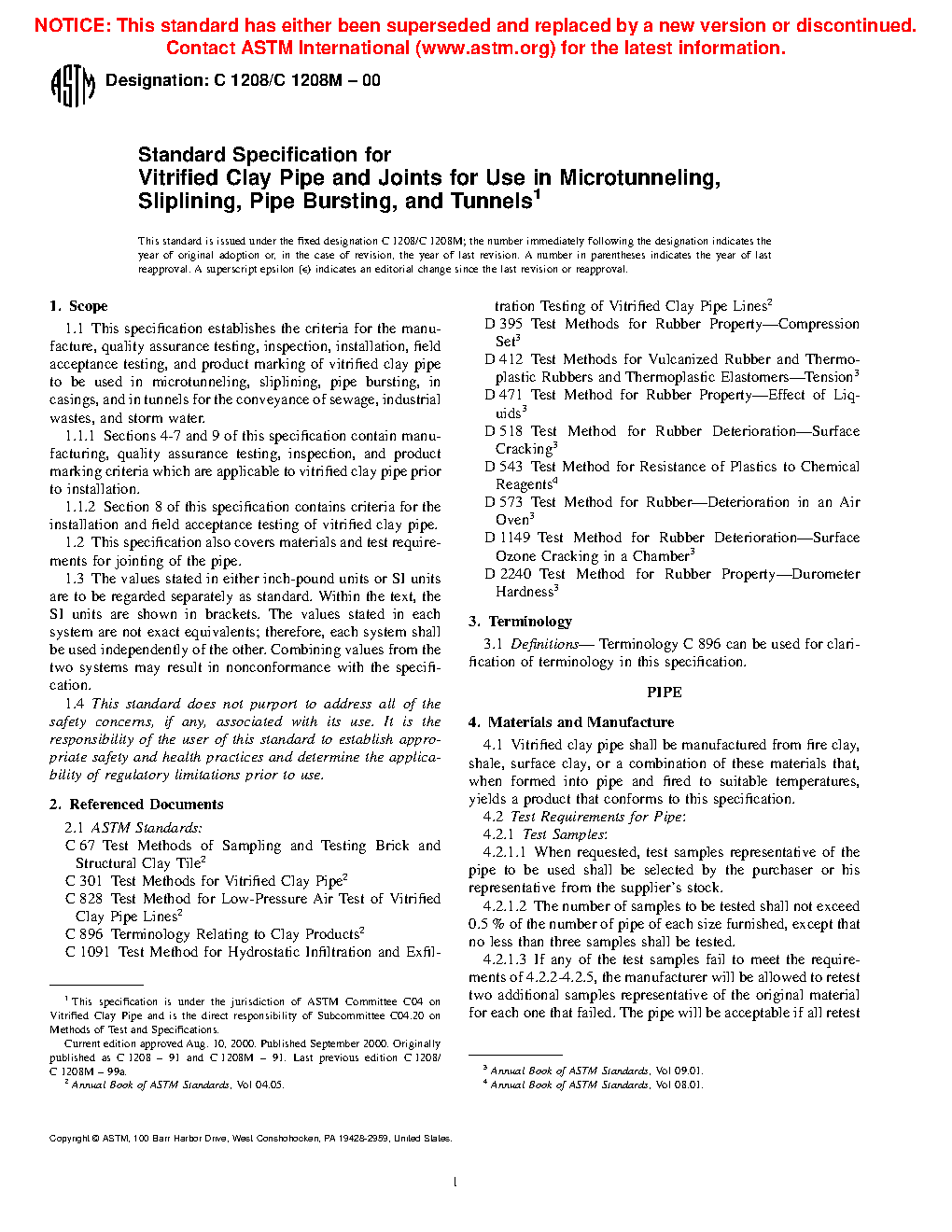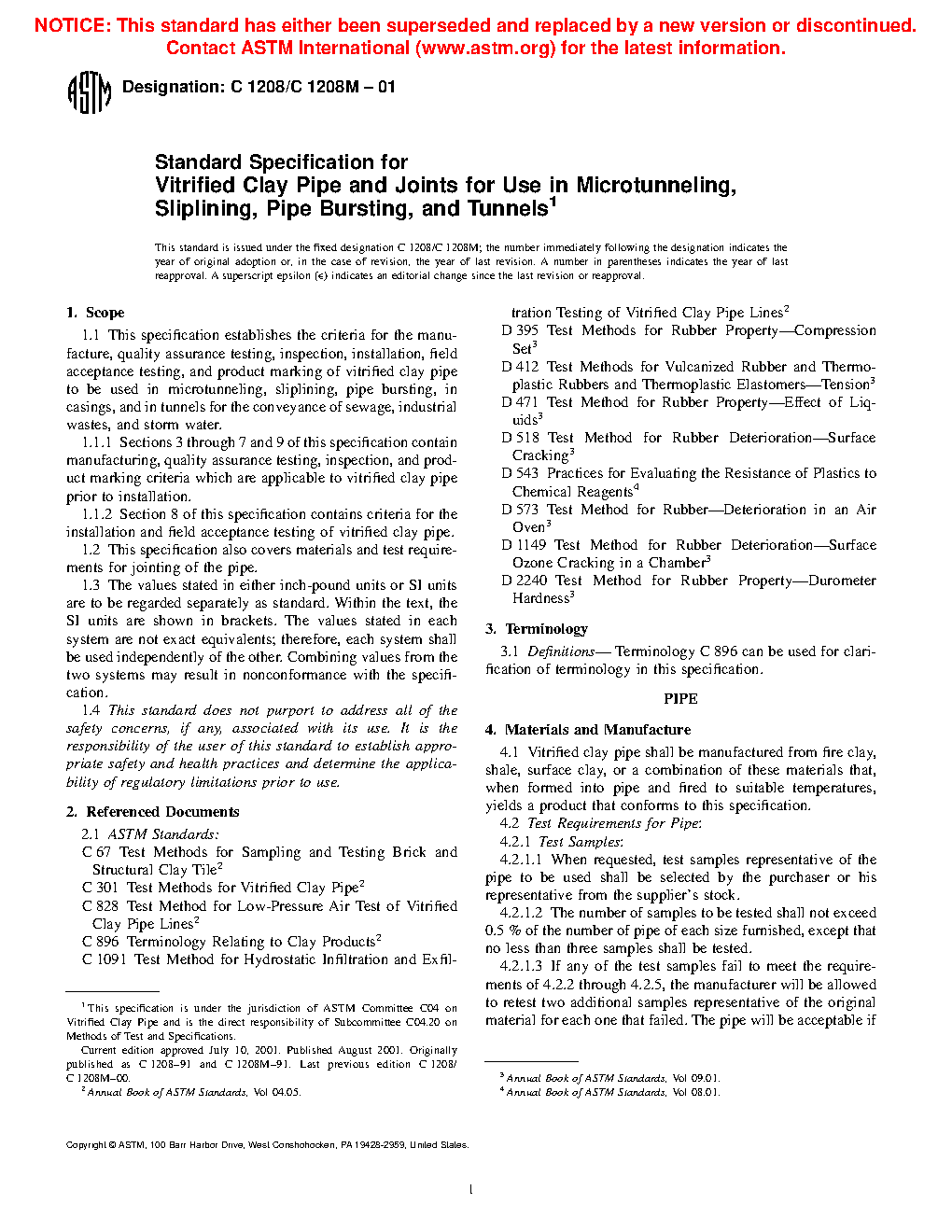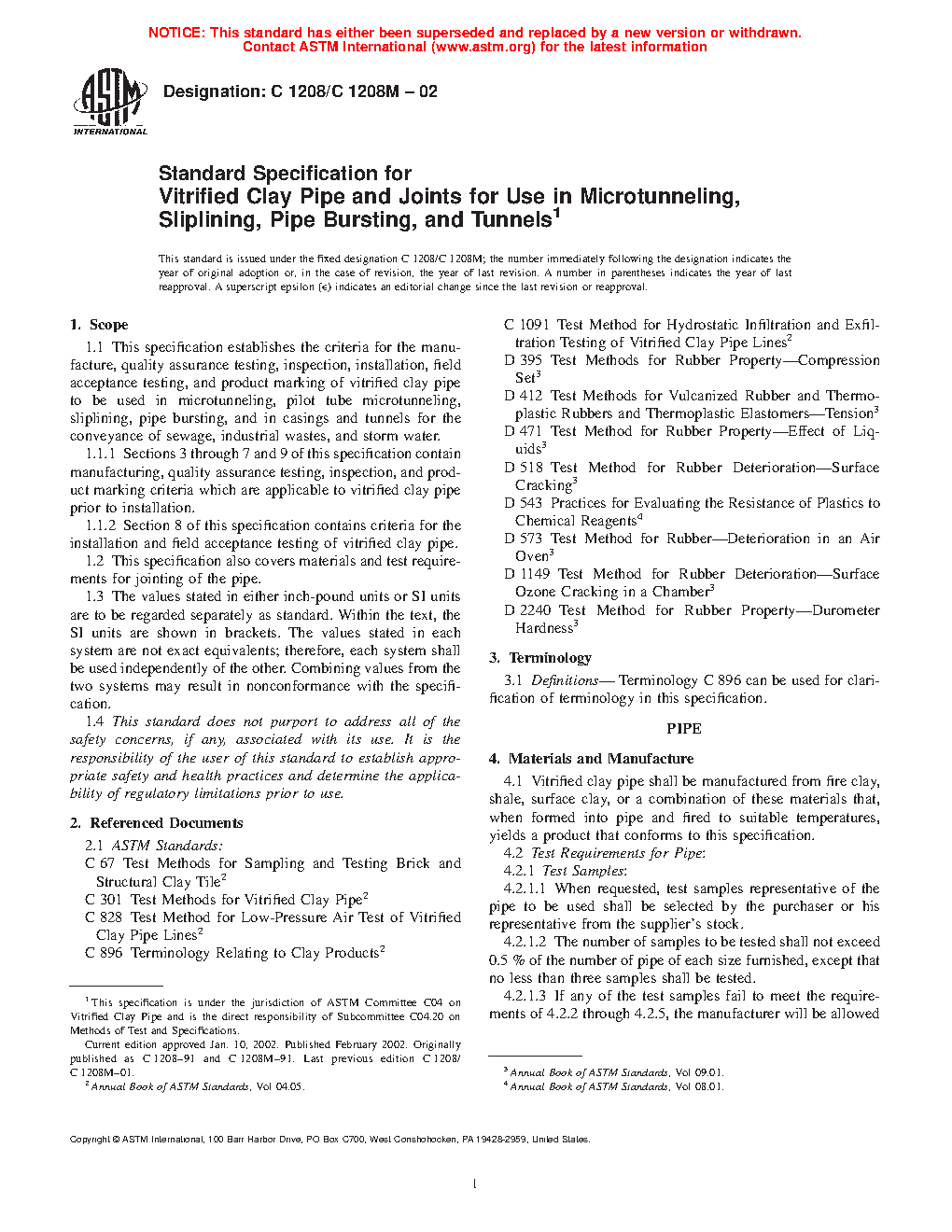 1.1 This specification establishes the criteria for the manufacture, quality assurance testing, inspection, installation, field acceptance testing, and product marking of vitrified clay jacking pipe to be used in microtunneling, the pilot tube method, sliplining, pipe bursting, and in casings and tunnels for the conveyance of sewage, industrial wastes, and storm water.