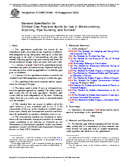 This specification establishes the criteria for the manufacture, quality assurance testing, inspection, installation, field acceptance testing, inspection, installation, field acceptance testing, and product marking of vitrified clay pipe to be used in microtunneling, pilot tube microtunneling, sliplining, pipe bursting, and in casings and tunnels for the conveyance of sewage, industrial wastes, and storm water. Vitrified clay pipe shall be manufactured from fire clay, shale, surface clay, or a combination of these materials that, when formed into pipe and fired to suitable temperatures, yields a product that conforms to this specification. Pipes of nominal diameters shall meet the prescribed bearing strength requirements. The clay pipe shall undergo the following tests: compressive strength test; hydrostatic pressure test; absorption test; and acid resistance test. The pipe shall conform to the required sizes and dimensions. The pipe shall not deviate from straight by more than a specified value when the maximum offset is measured from the concave side of the pipe. The pipe wall thickness shall be a suitable dimension to adequately distribute the field jacking forces. There shall be no fractures or cracks passing through the carrel, visible to the unaided eye. Chips, fractures, or blisters on the pipe shall not exceed a specified value in any surface dimension and shall not exceed a required depth of the minimum thickness of the barrel. Principles of joint design, test requirements, and test methods for assembled joints shall also be indicated.