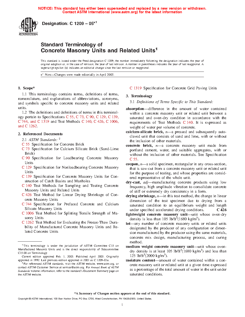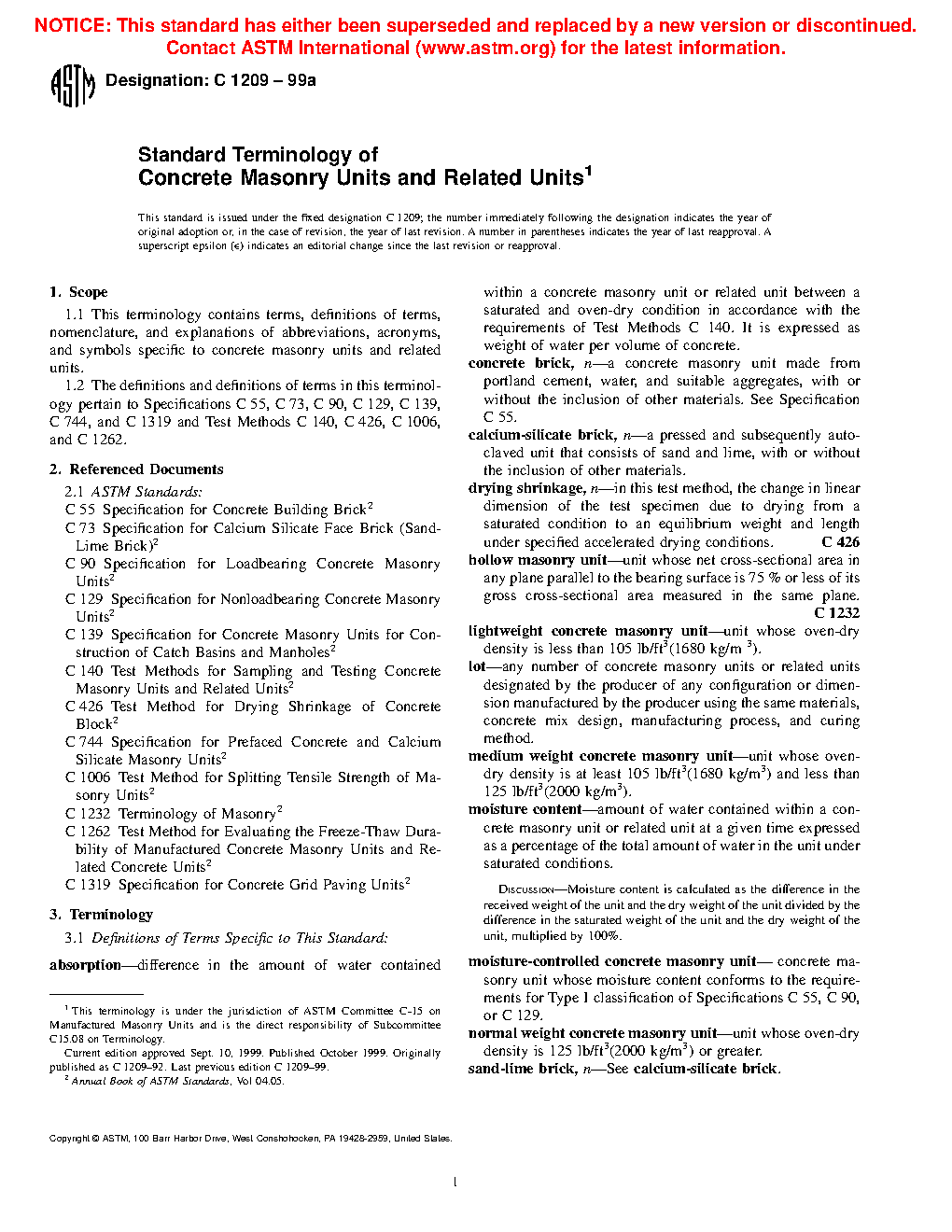 1.2 The definitions and descriptions of terms in this terminology pertain to Specifications C55, C73, C90, C129, C139, C744, and C1319 and Test Methods C140, C426, C1006, and C1262.
