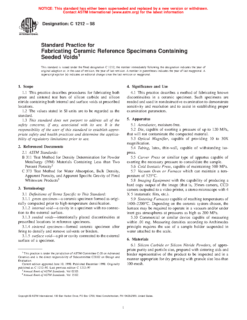 1.1 This practice describes procedures for fabricating both green and sintered test bars of silicon carbide and silicon nitride containing both internal and surface voids at prescribed locations.