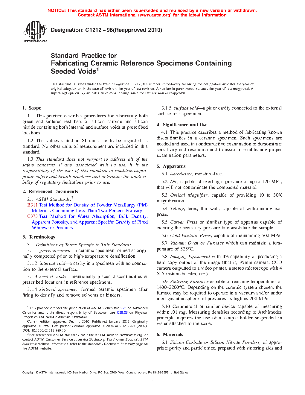 4.1 This practice describes a method of fabricating known discontinuities in a ceramic specimen. Such specimens are needed and used in nondestructive examination to demonstrate sensitivity and resolution and to assist in establishing proper examination parameters.