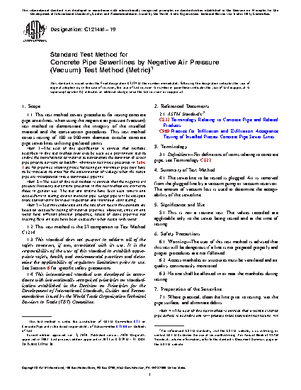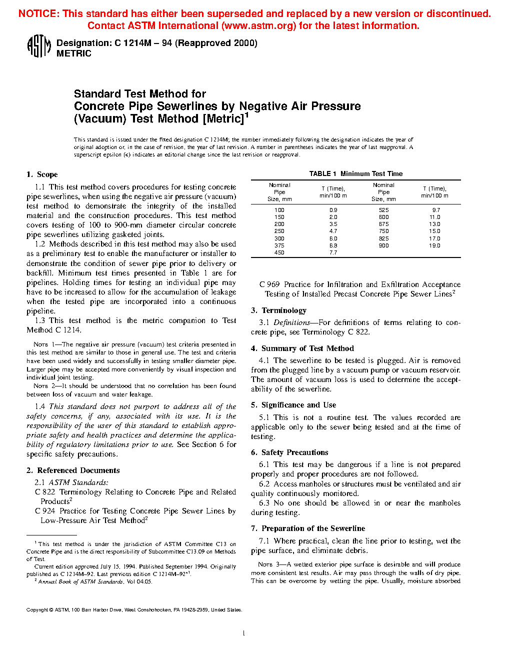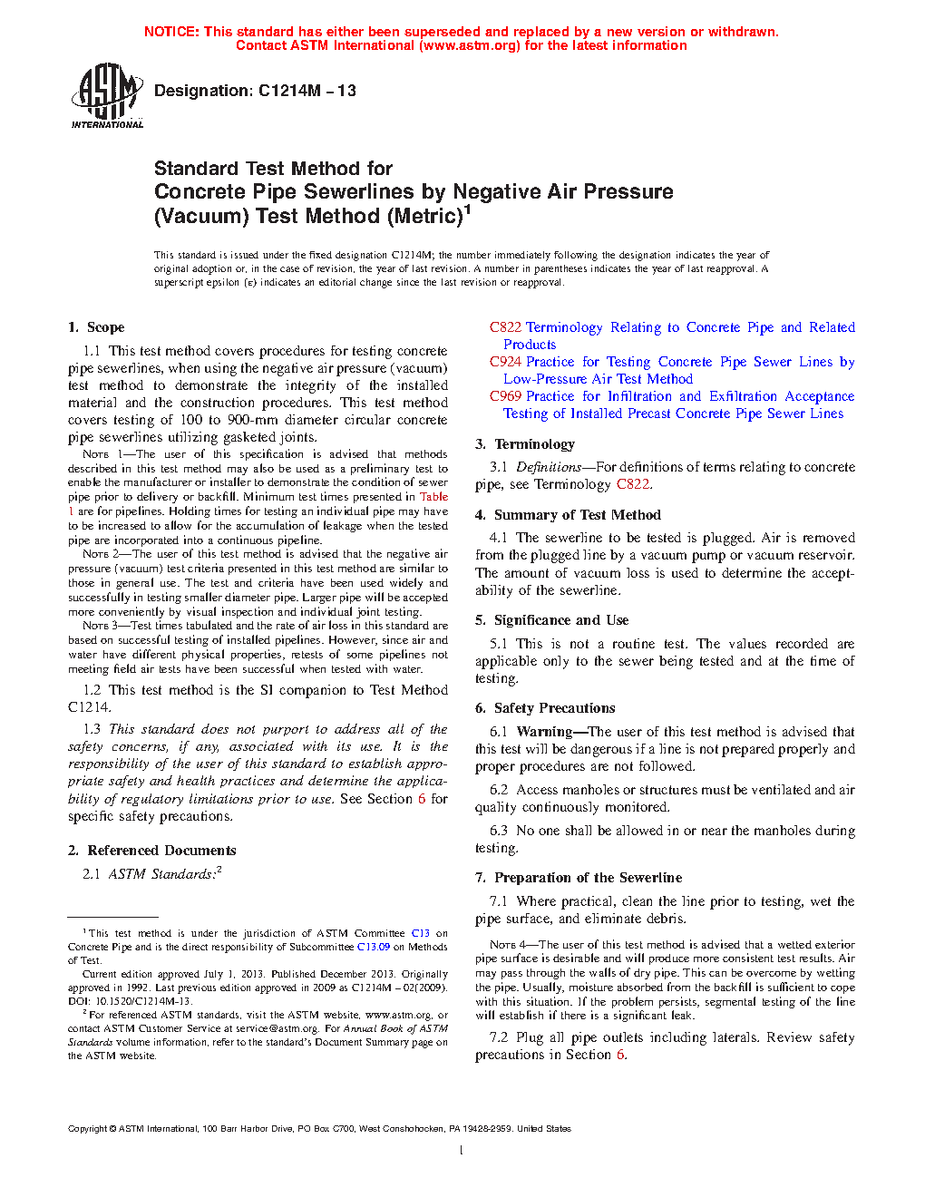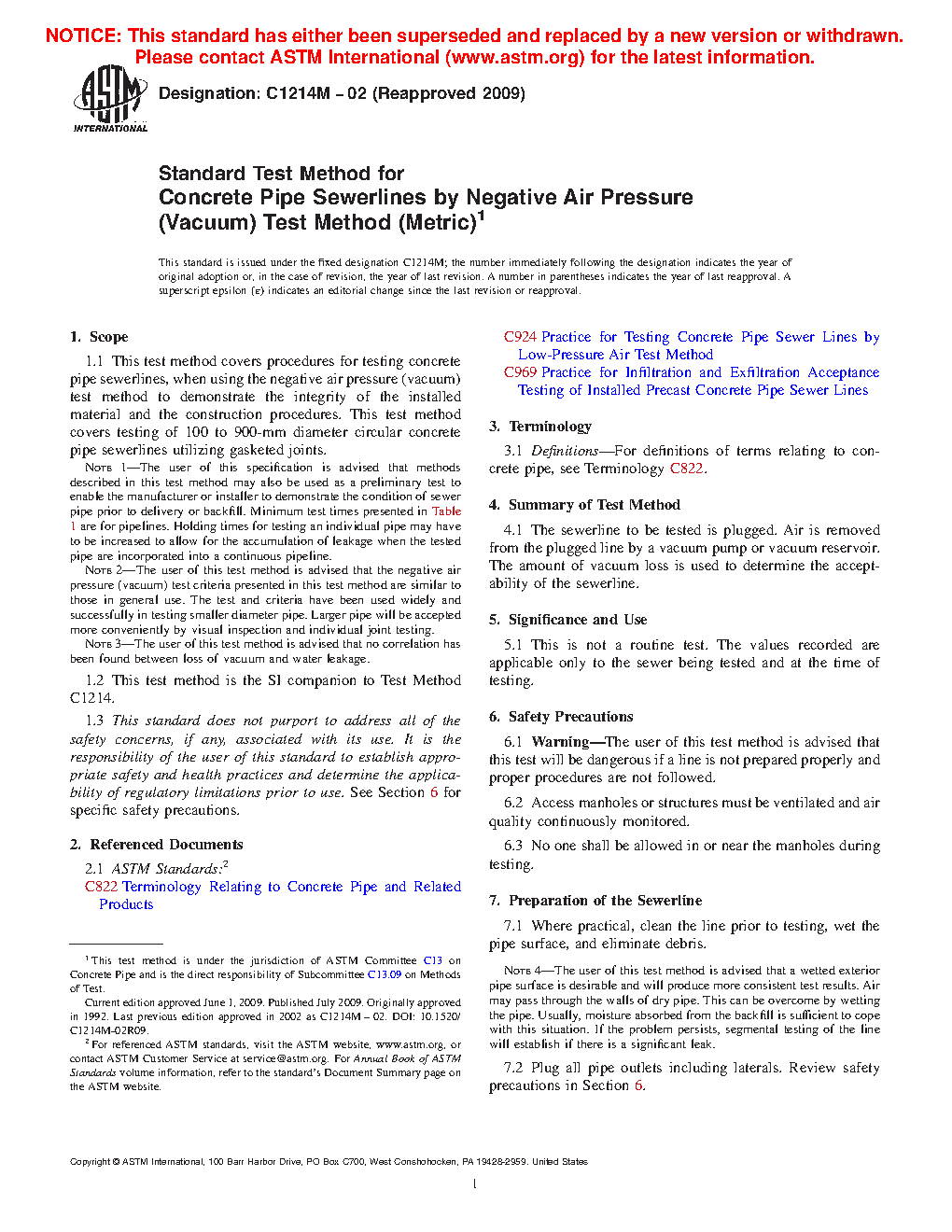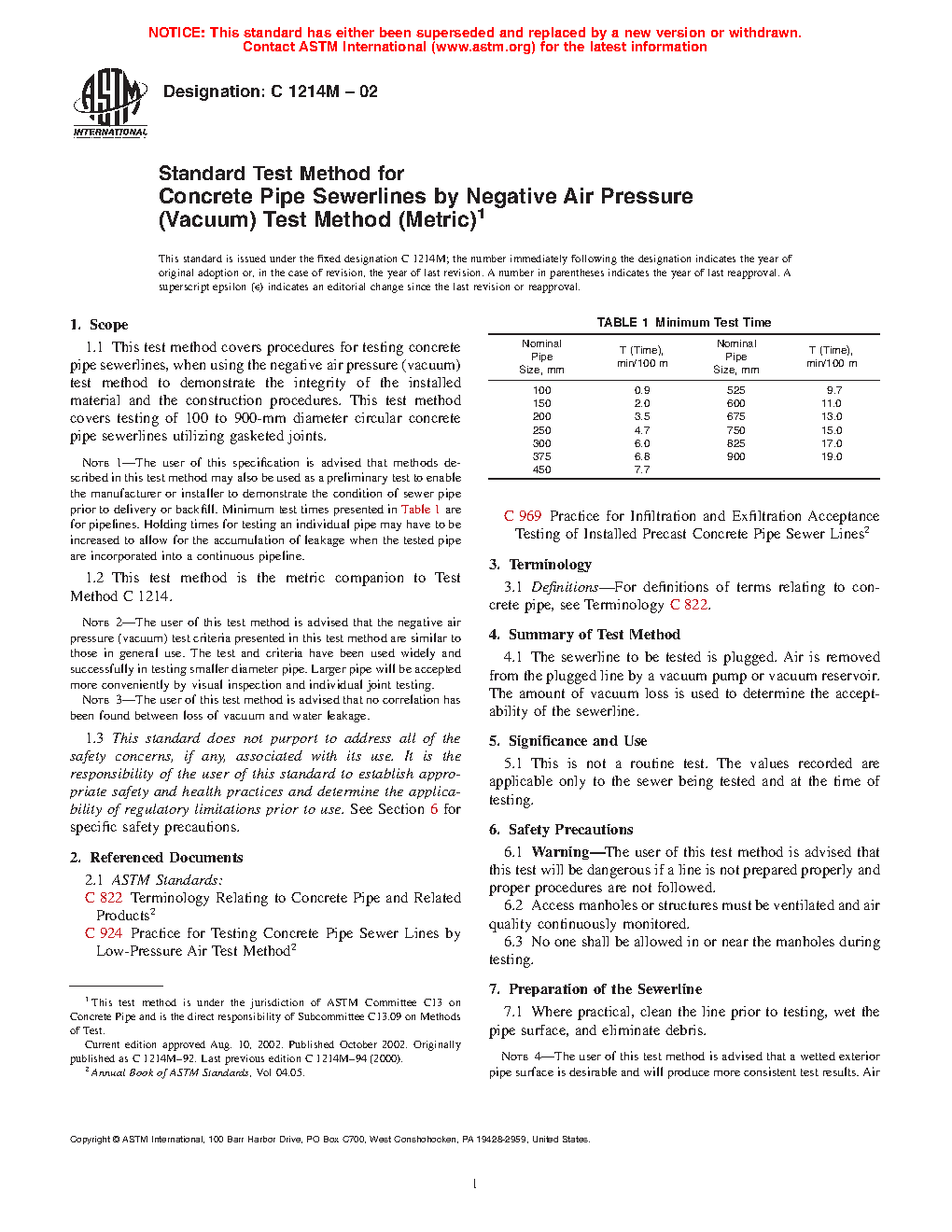 Note 1--The negative air pressure (vacuum) test criteria presented in this test method are similar to those in general use. The test and criteria have been used widely and successfully in testing smaller diameter pipe. Larger pipe may be accepted more conveniently by visual inspection and individual joint testing.