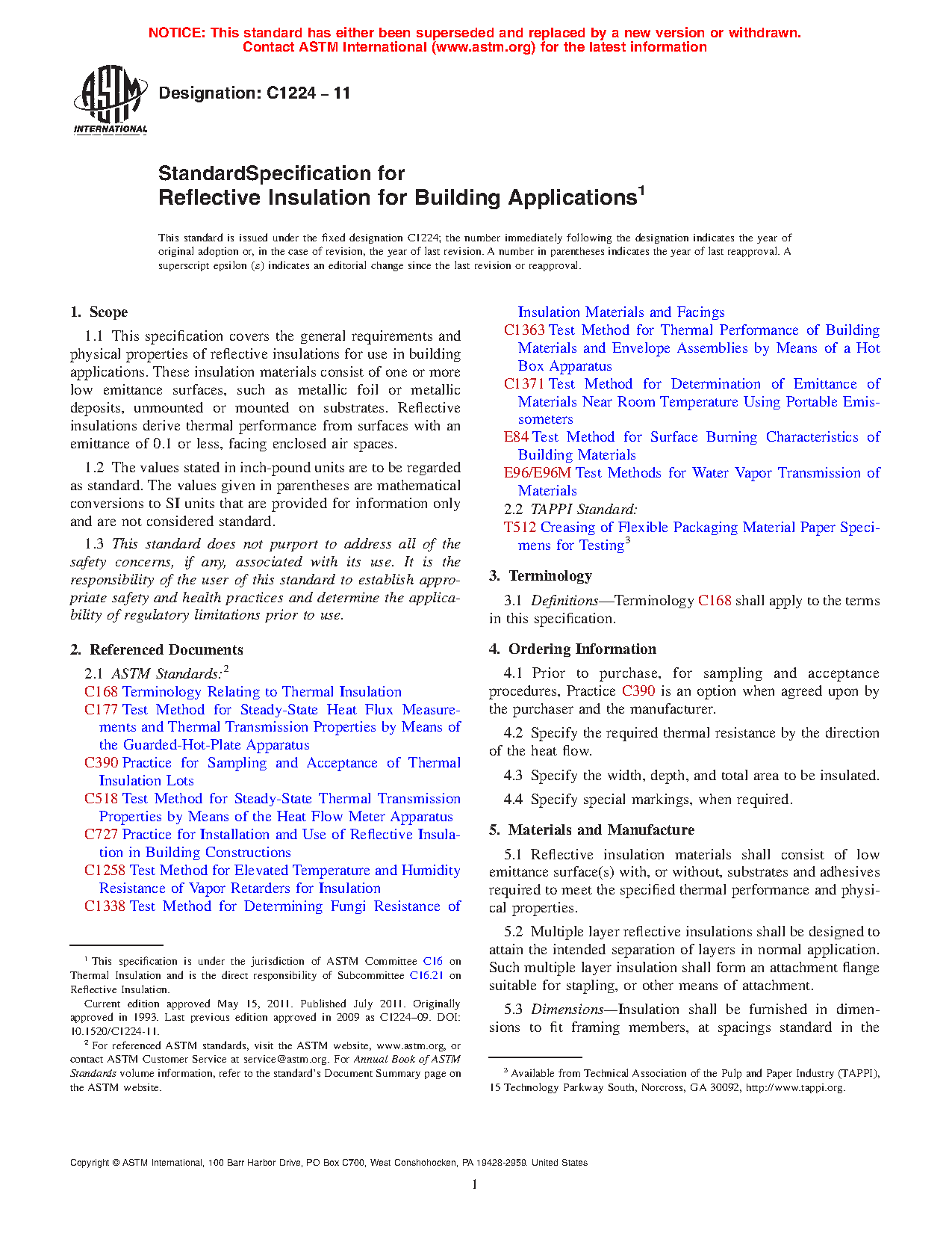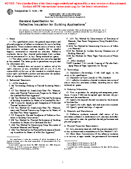 This specification covers the general requirements and physical properties of reflective insulations for use in building applications. These insulation materials consist of one or more low emittance surfaces, such as metallic foil or metallic deposits, unmounted or mounted on substrates. Reflective insulation materials shall consist of low emittance surface(s) with, or without, substrates and adhesives required to meet the specified thermal performance and physical properties. The physical properties of reflective insulation are presented in details. The emittance, permeance, surface burning characteristics, humidity resistance, fungi resistance, thermal performance of reflective insulation shall be tested to meet the requirements prescribed.