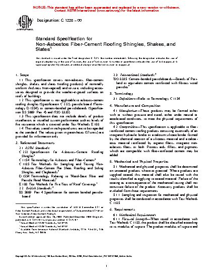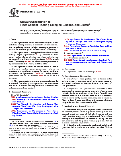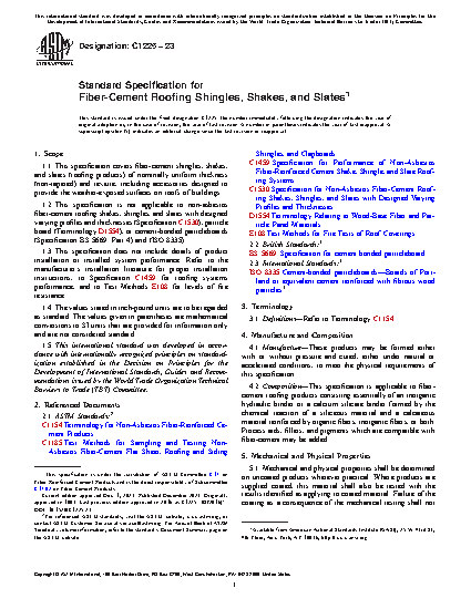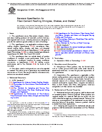 1.1 This specification covers non-asbestos, fiber-cement shingles, shakes, and slates (roofing products) of nominally uniform thickness (non-tapered) and texture, including accessories designed to provide the weather-exposed surfaces on roofs of buildings.