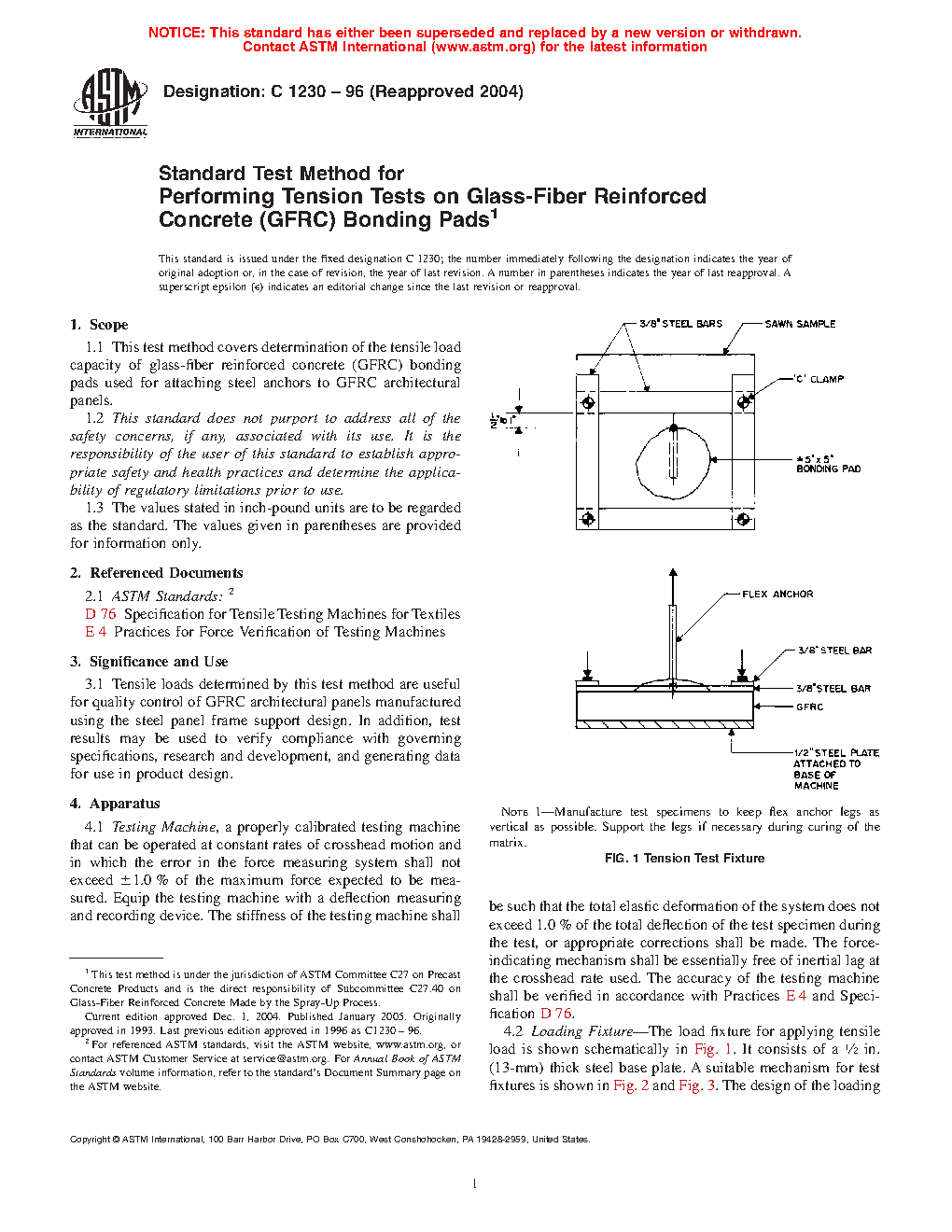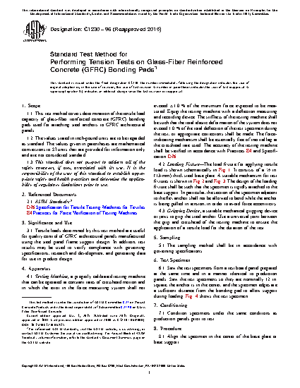 1.1 This test method covers determination of the tensile load capacity of glass-fiber reinforced concrete (GFRC) bonding pads used for attaching steel anchors to GFRC architectural panels.
