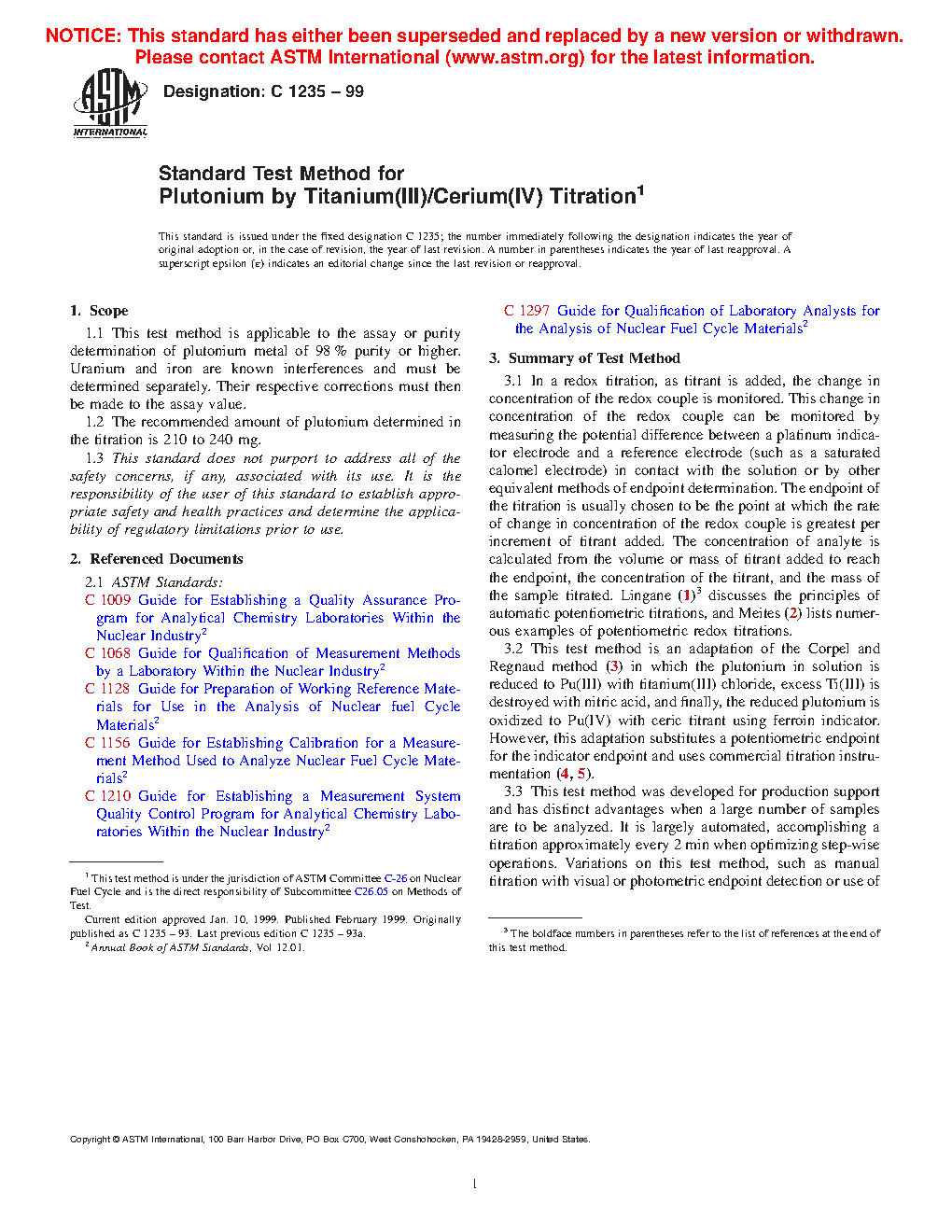 Standard Test Method for Plutonium by Titanium(III)/Cerium(IV) Titration (Withdrawn 2005)