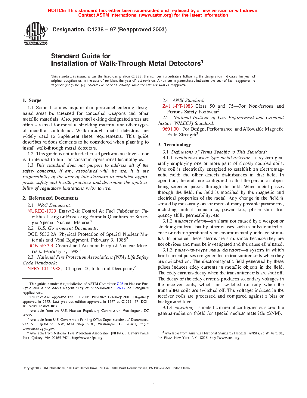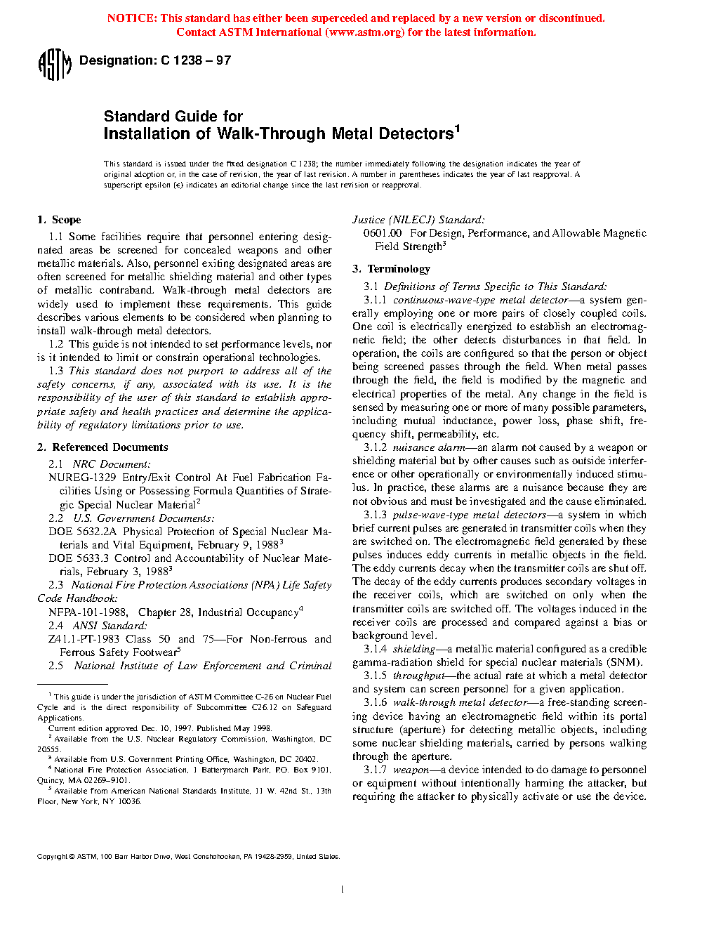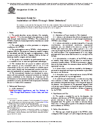 This guide is intended for use by the designers, evaluators, and users of walk-through metal detectors to be installed to screen persons entering or leaving a controlled access area. This guide is not meant to constrain design liberty but is to be used as a guide in the selection of location and installation of walk-through metal detectors.