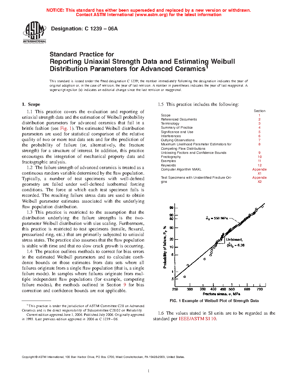 1.1 This practice covers the evaluation and reporting of uniaxial strength data and the estimation of Weibull probability distribution parameters for advanced ceramics that fail in a brittle fashion (see ). The estimated Weibull distribution parameters are used for statistical comparison of the relative quality of two or more test data sets and for the prediction of the probability of failure (or, alternatively, the fracture strength) for a structure of interest. In addition, this practice encourages the integration of mechanical property data and fractographic analysis.