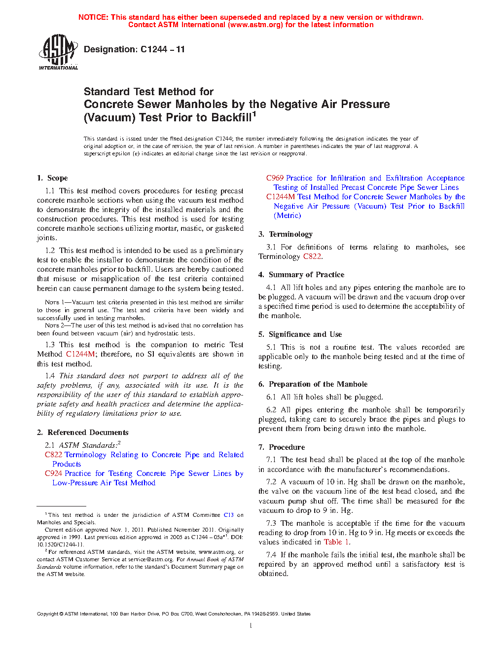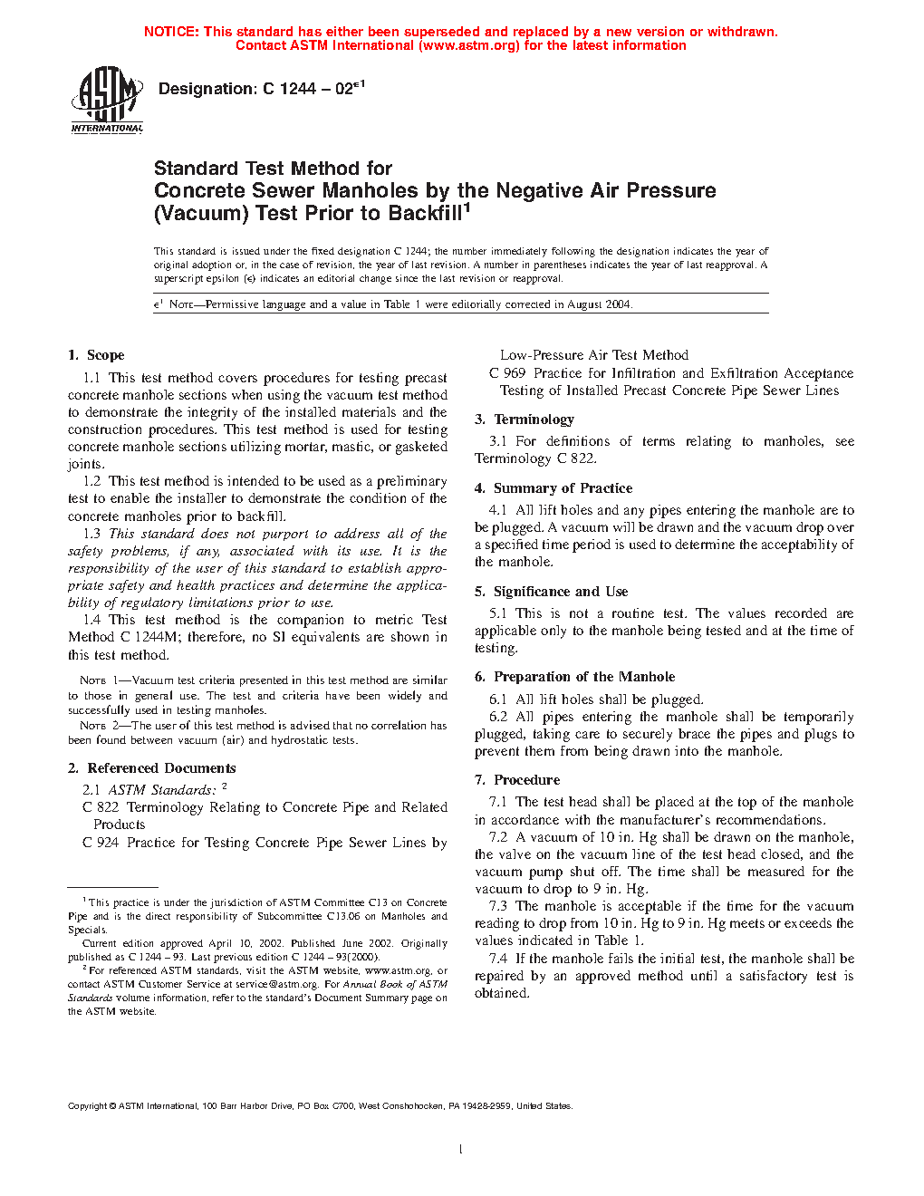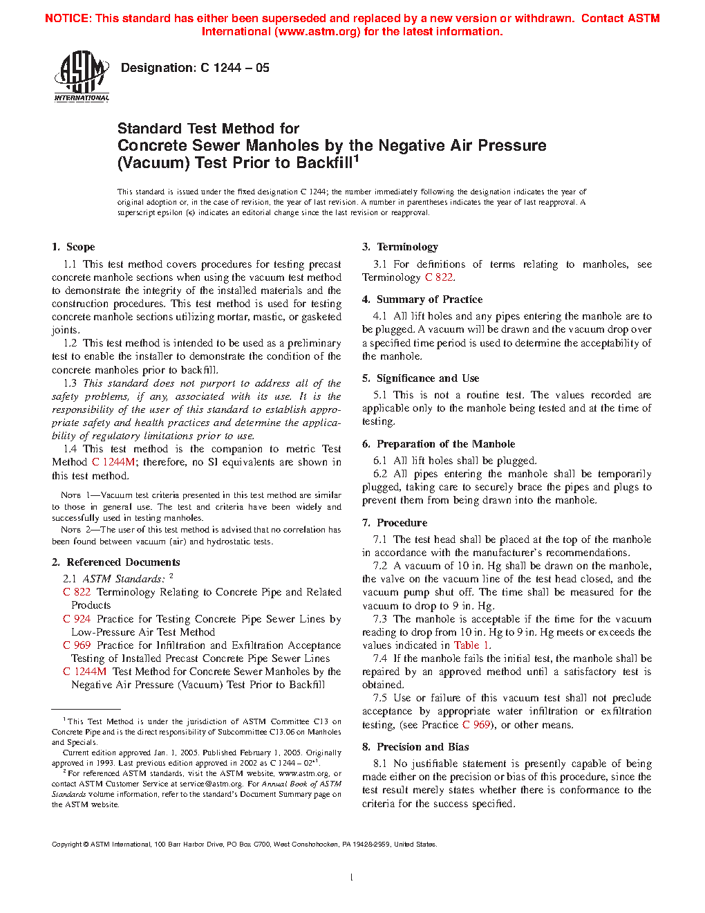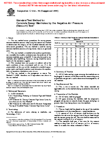 Note 1—Vacuum test criteria presented in this test method are similar to those in general use. The test and criteria have been widely and successfully used in testing manholes.