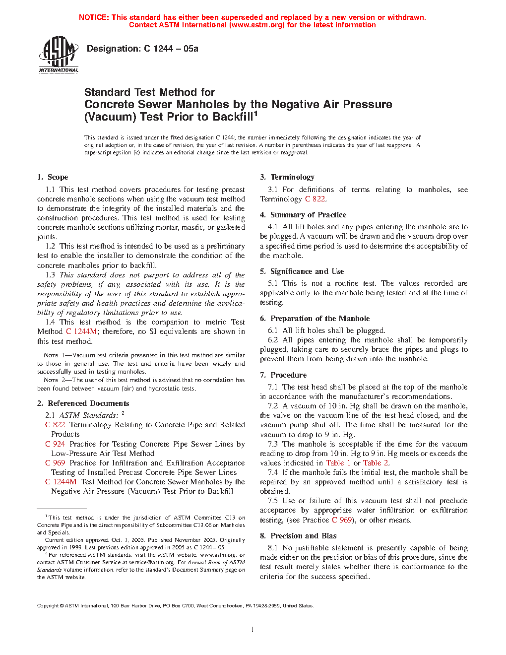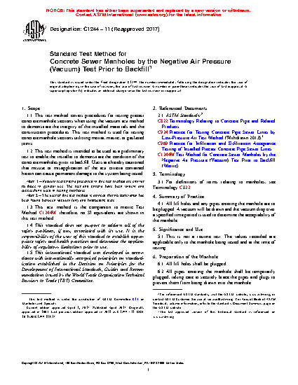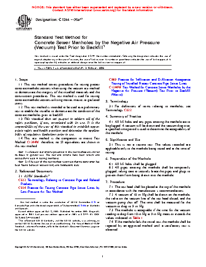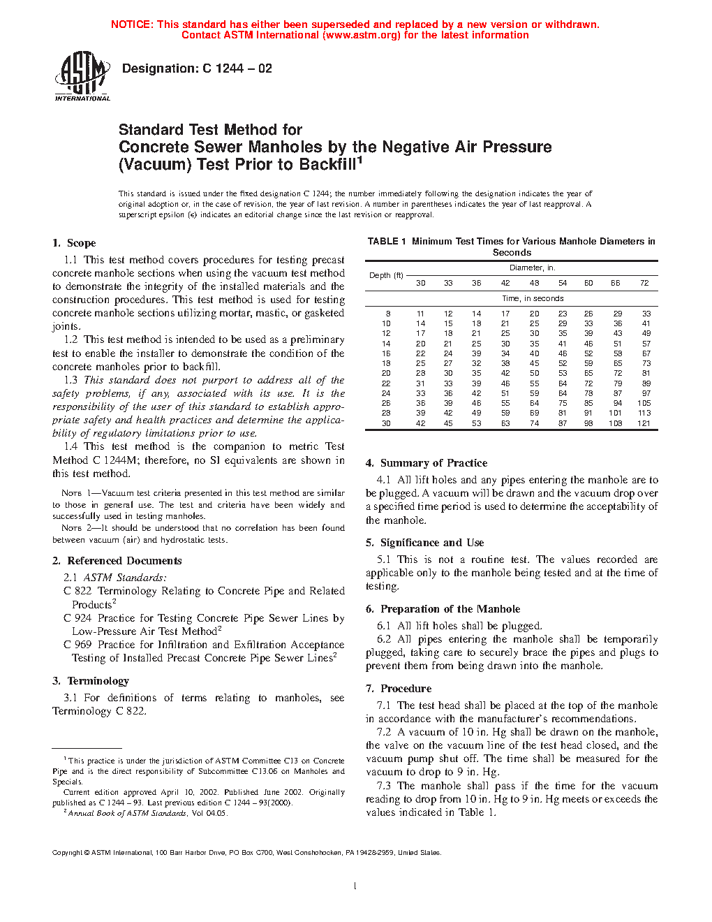 Note 1—Vacuum test criteria presented in this test method are similar to those in general use. The test and criteria have been widely and successfully used in testing manholes.