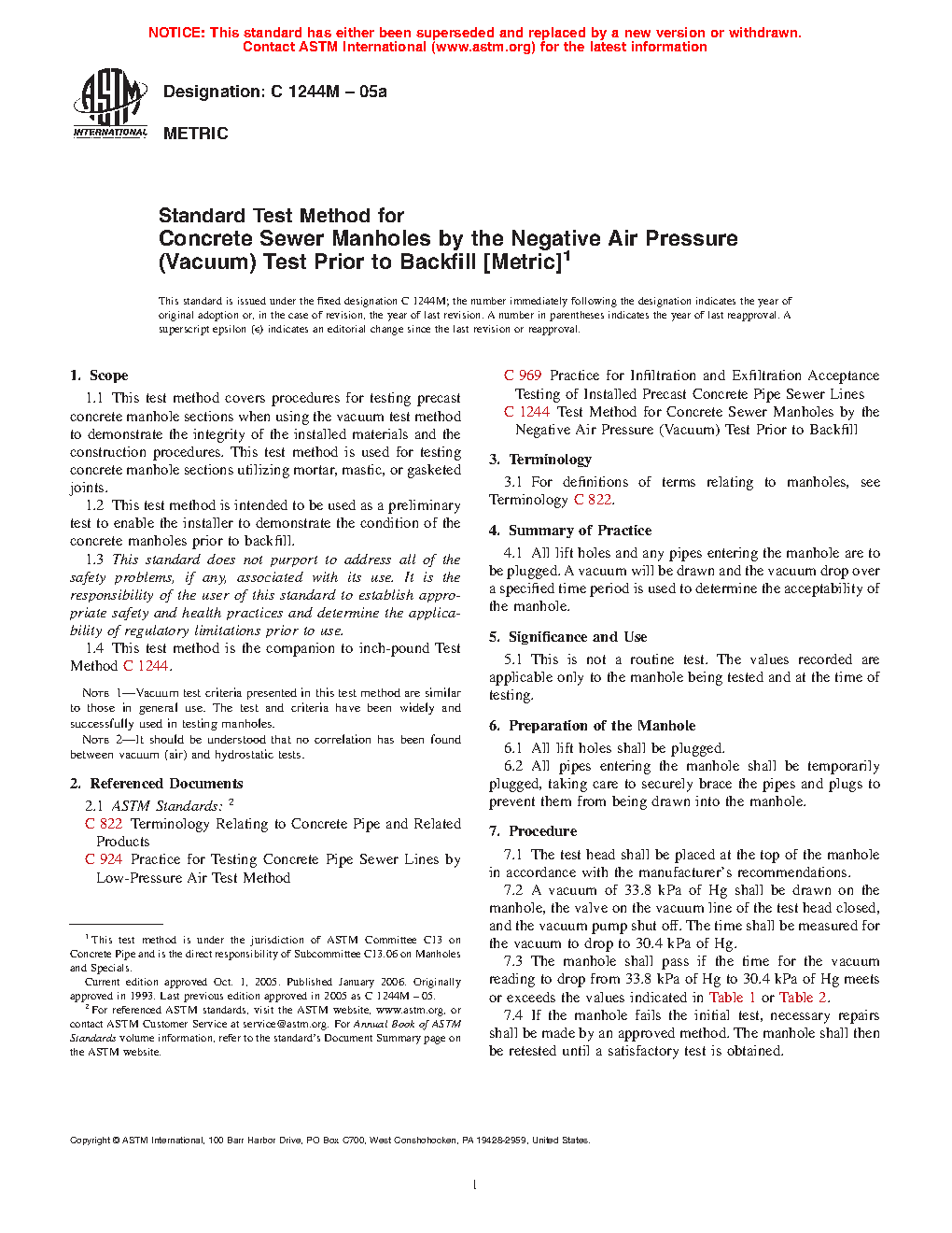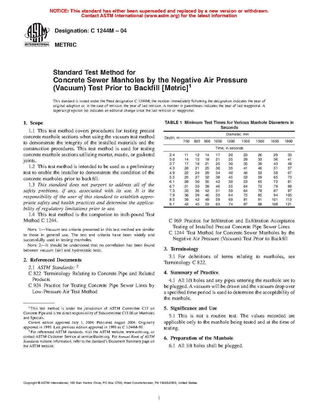 Note 1: Vacuum test criteria presented in this test method are similar to those in general use. The test and criteria have been widely and successfully used in testing manholes.