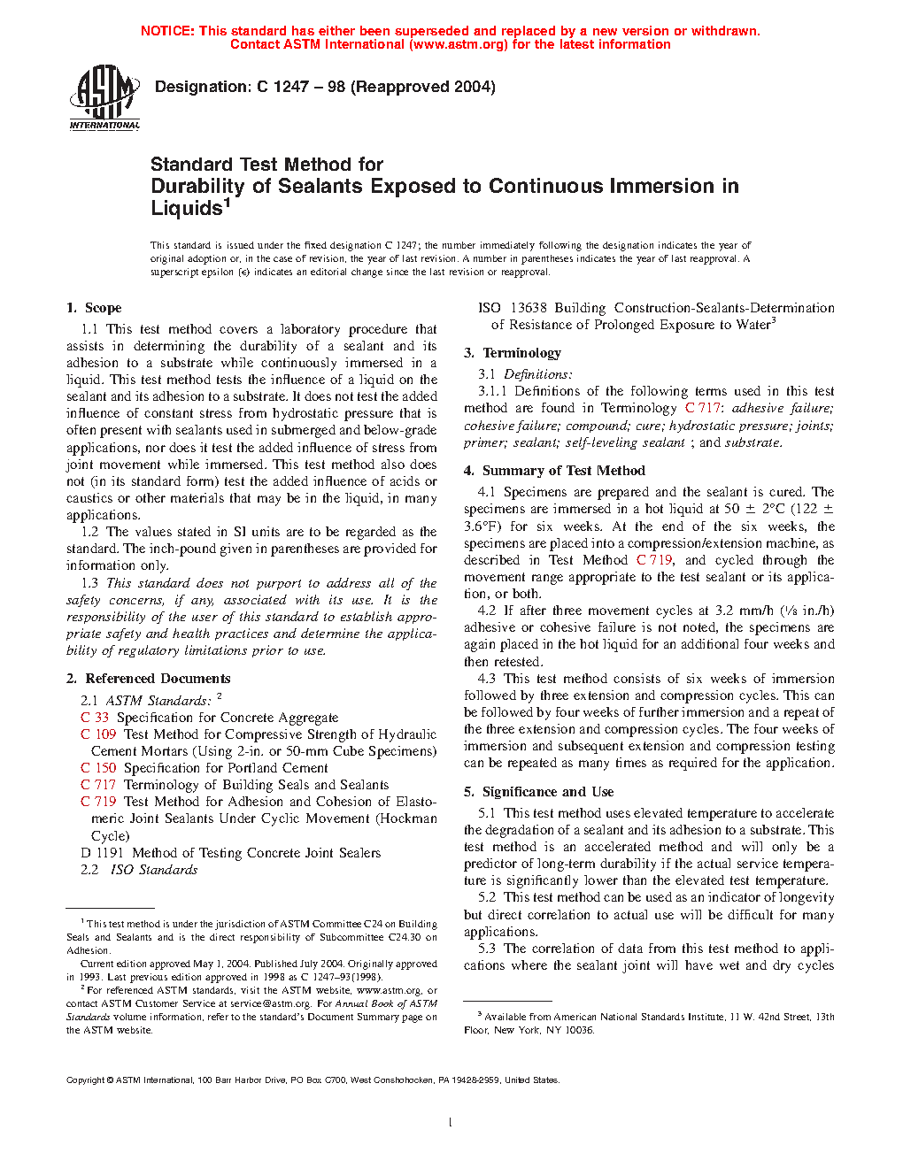 1.1 This test method covers a laboratory procedure that assists in determining the durability of a sealant and its adhesion to a substrate while continuously immersed in a liquid. This test method tests the influence of a liquid on the sealant and its adhesion to a substrate. It does not test the added influence of constant stress from hydrostatic pressure that is often present with sealants used in submerged and below-grade applications, nor does it test the added influence of stress from joint movement while immersed. This test method also does not (in its standard form) test the added influence of acids or caustics or other materials that may be in the liquid, in many applications.