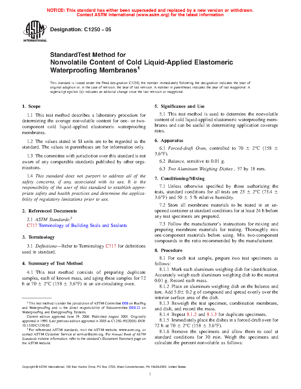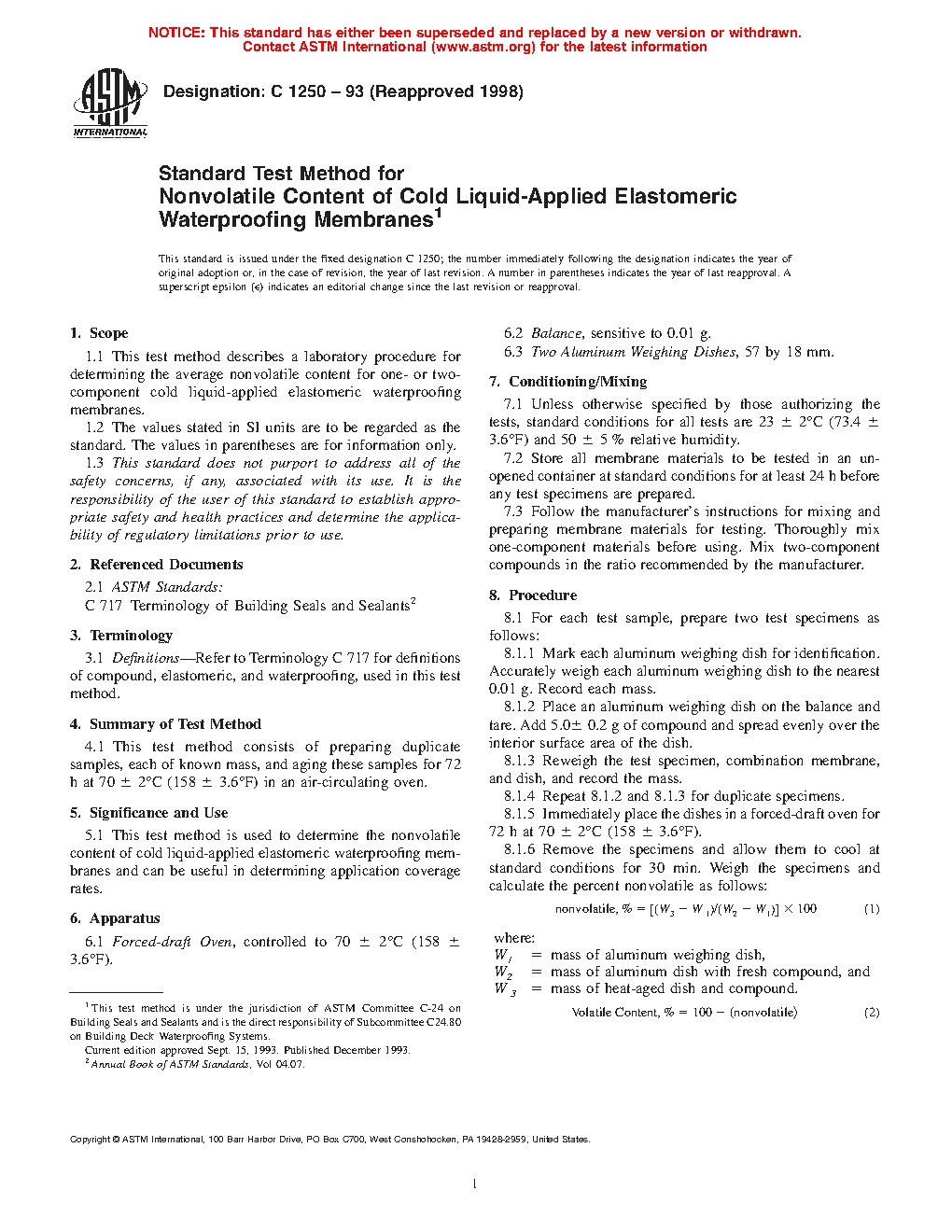 Standard Test Method for Nonvolatile Content of Cold Liquid-Applied Elastomeric Waterproofing Membranes