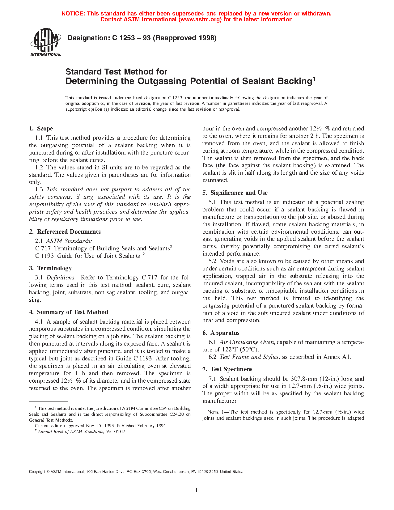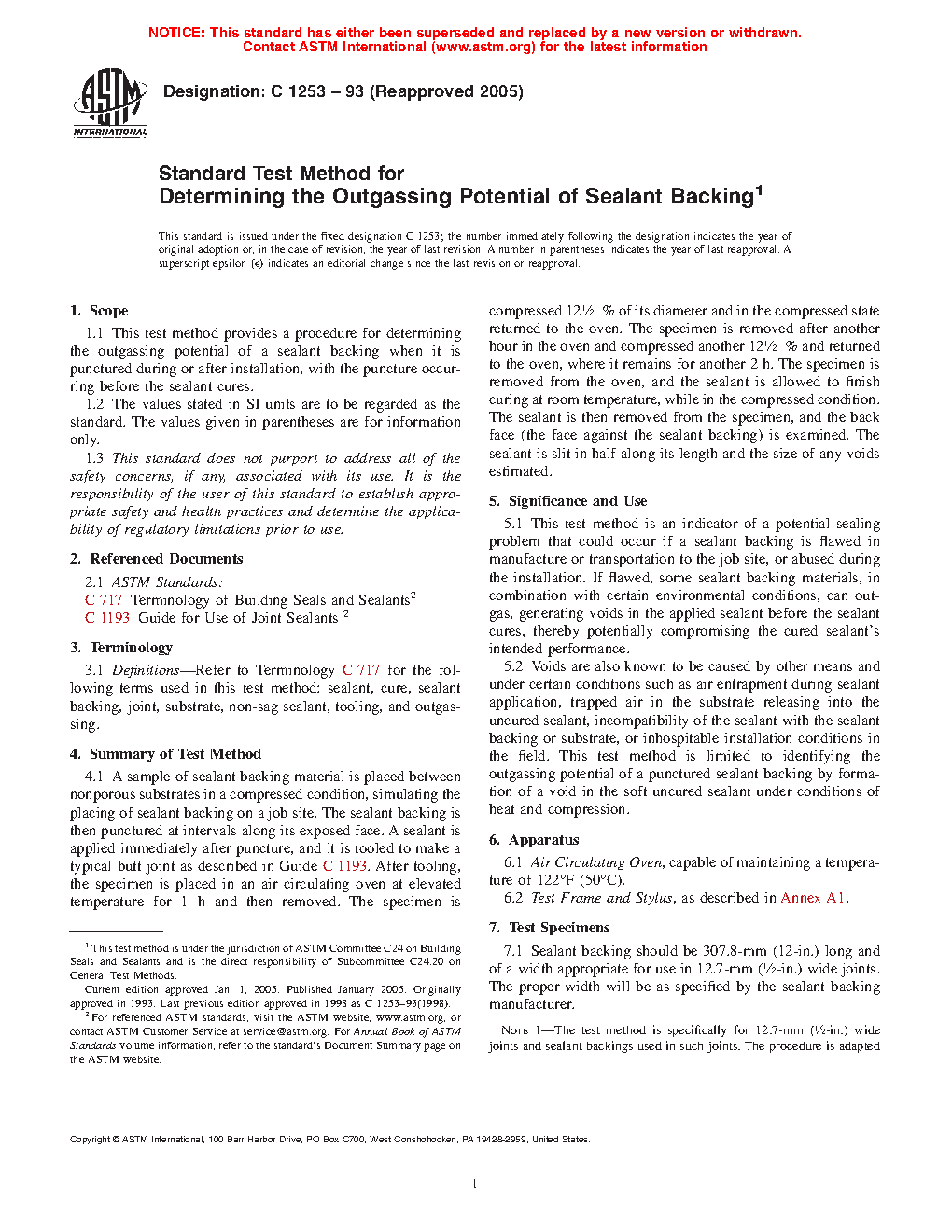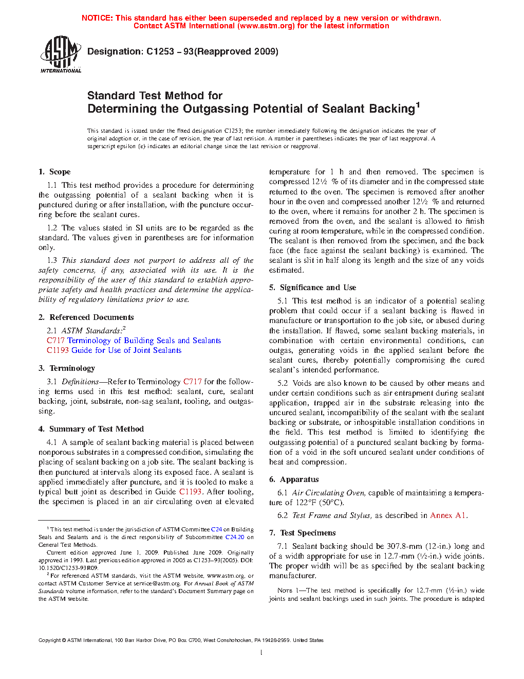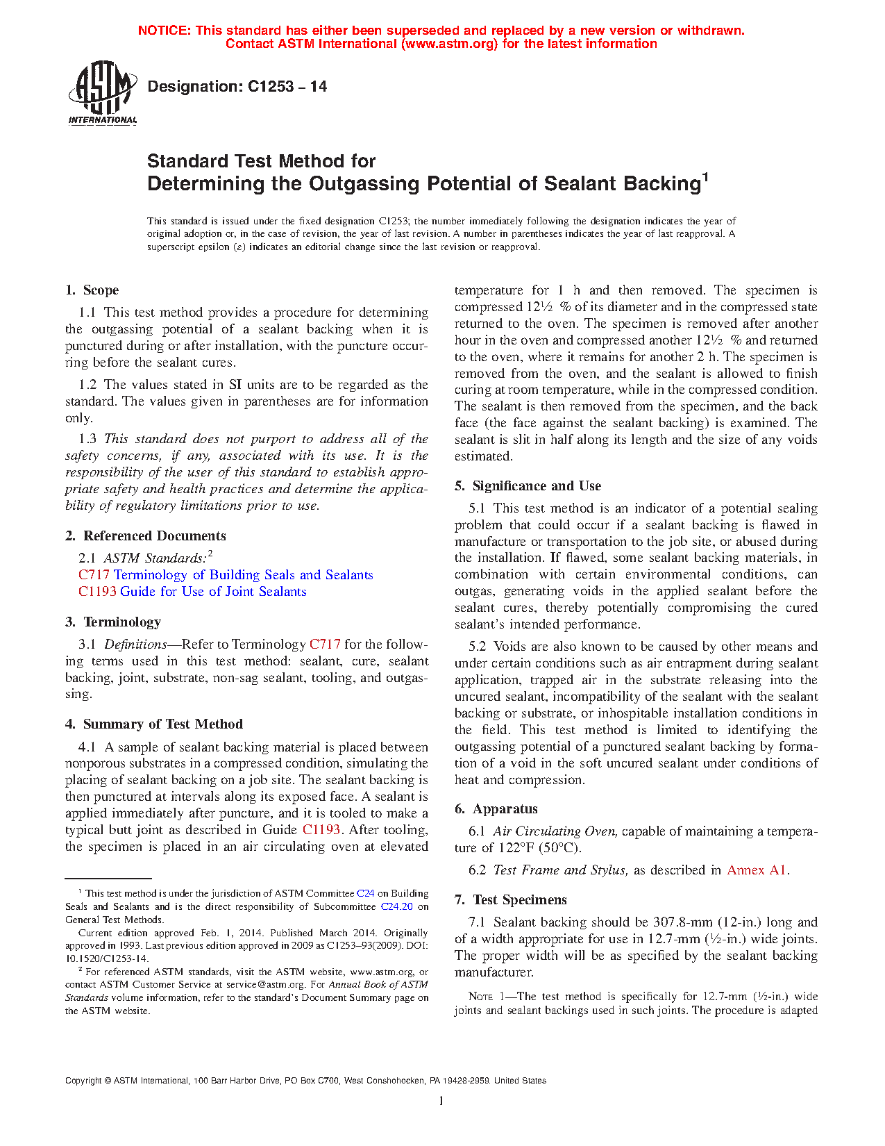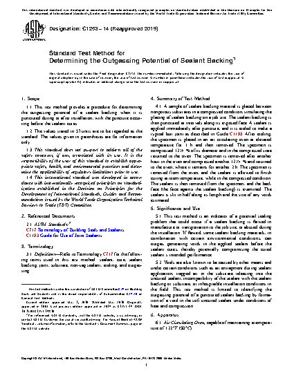 1.1 This test method provides a procedure for determining the outgassing potential of a sealant backing when it is punctured during or after installation, with the puncture occurring before the sealant cures.