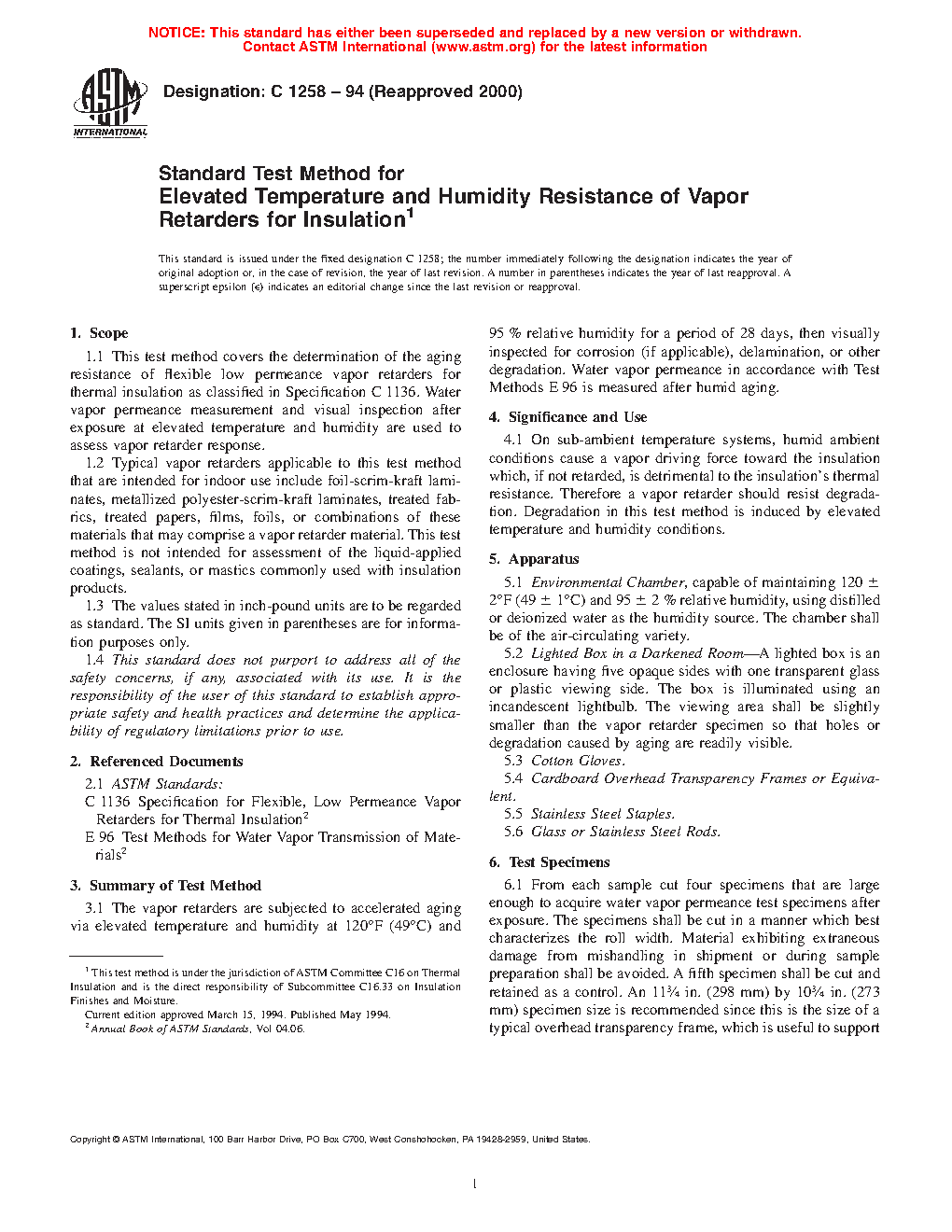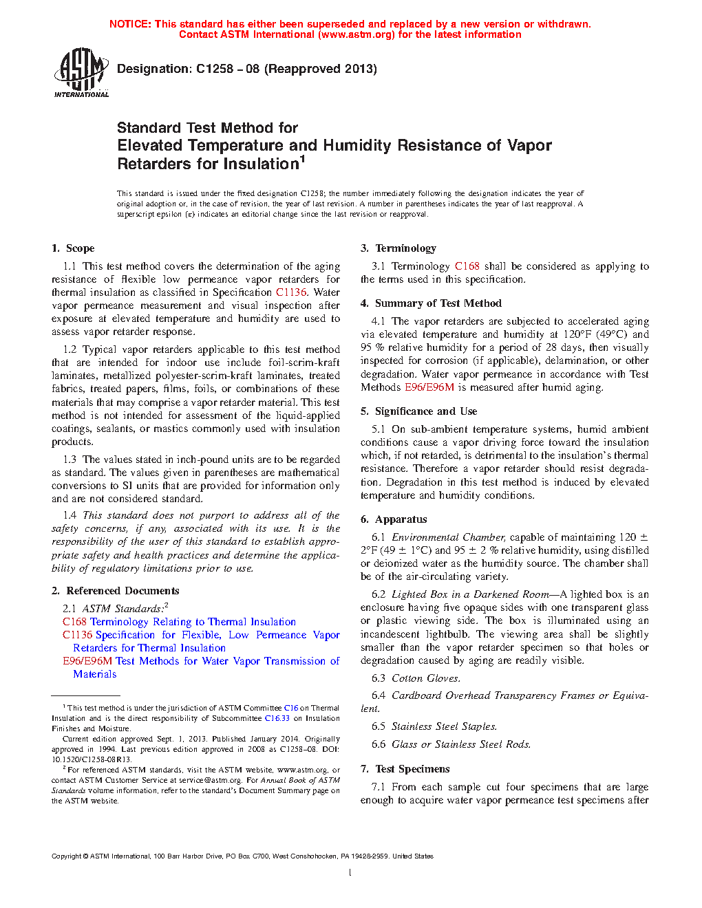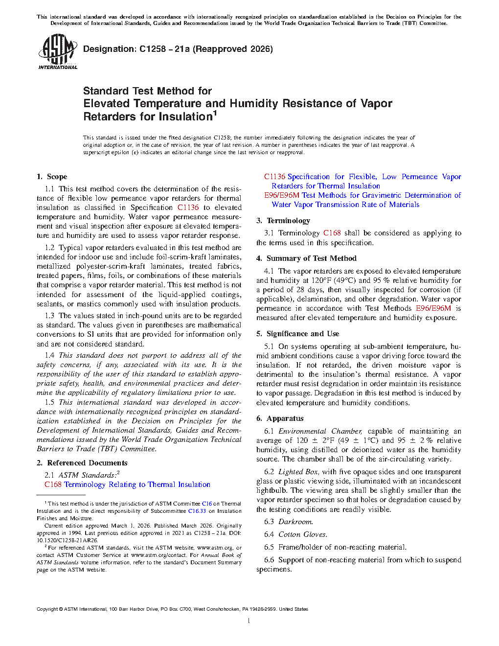 1.1 This test method covers the determination of the resistance of flexible low permeance vapor retarders for thermal insulation as classified in Specification C1136 to elevated temperature and humidity. Water vapor permeance measurement and visual inspection after exposure at elevated temperature and humidity are used to assess vapor retarder response.