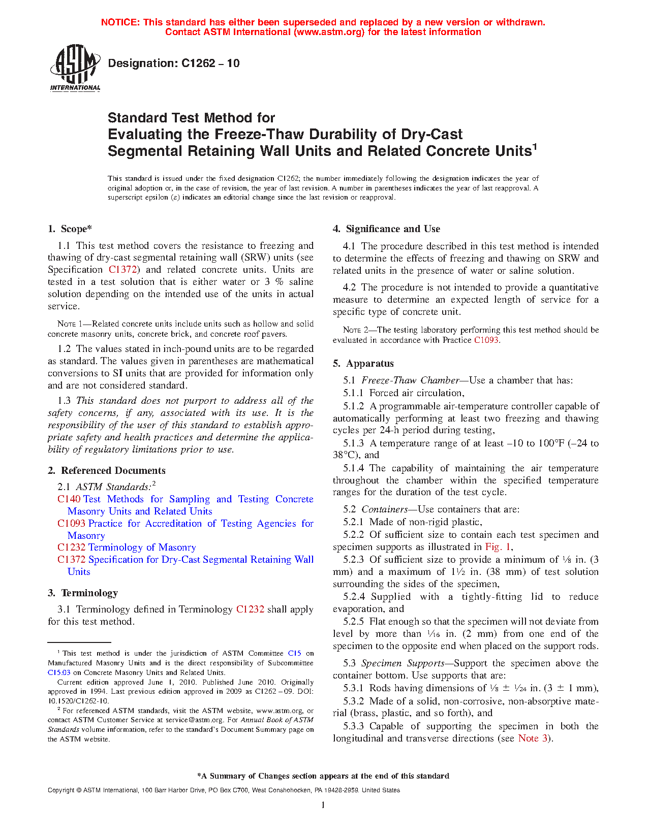 1.1 This test method covers the resistance to freezing and thawing of dry-cast segmental retaining wall (SRW) units (see Specification C1372) and related concrete units. Units are tested in a test solution that is either potable tap water or 3 % saline solution depending on the intended use of the units in actual service.