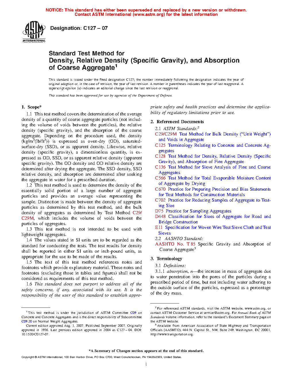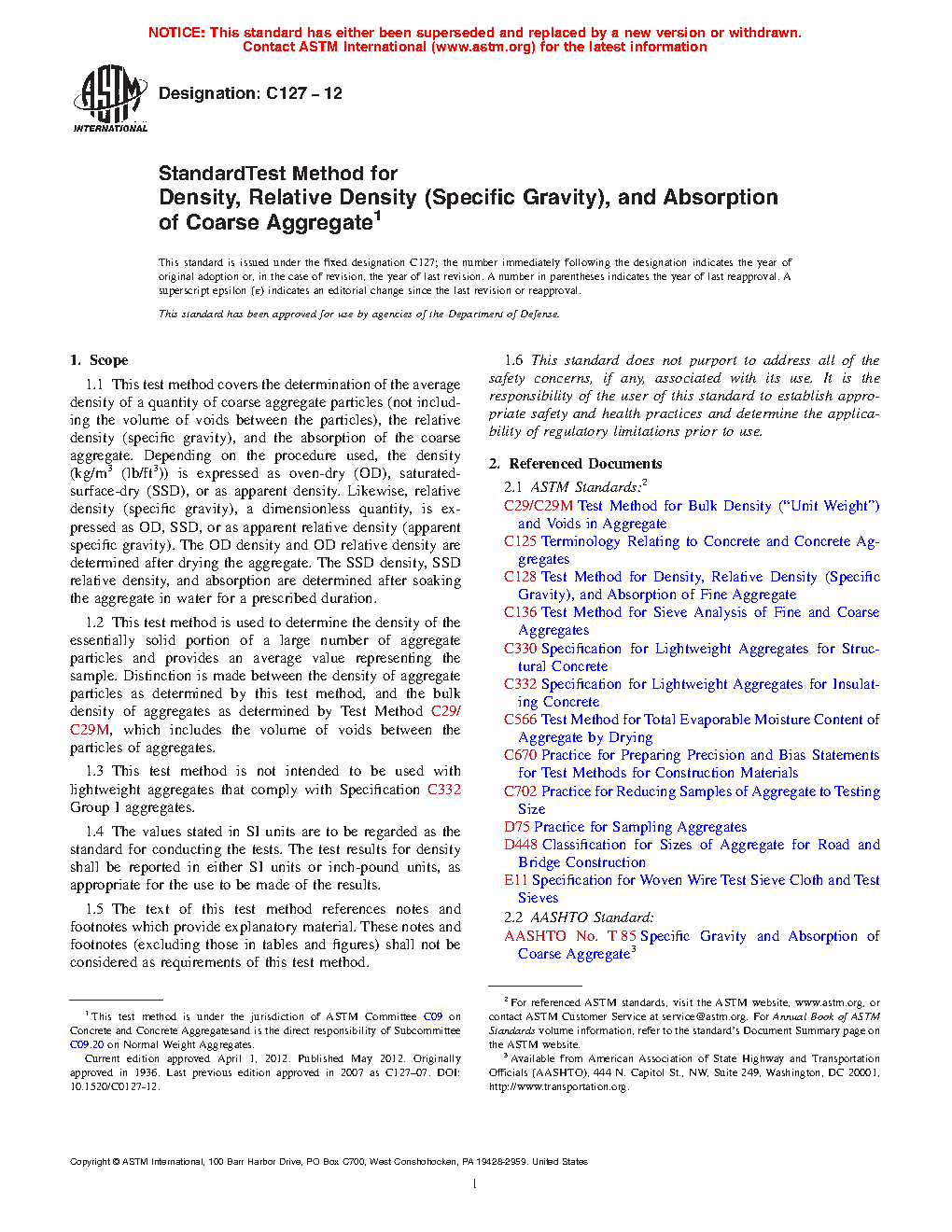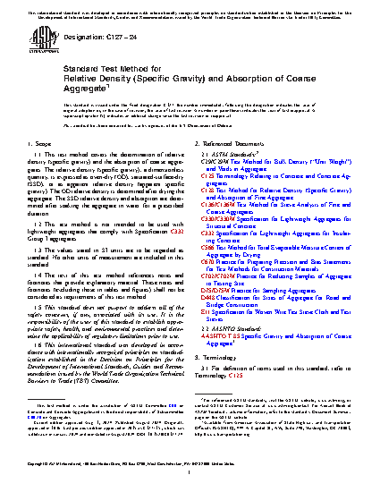 1.1 This test method covers the determination of relative density (specific gravity) and the absorption of coarse aggregates. The relative density (specific gravity), a dimensionless quantity, is expressed as oven-dry (OD), saturated-surface-dry (SSD), or as apparent relative density (apparent specific gravity). The OD relative density is determined after drying the aggregate. The SSD relative density and absorption are determined after soaking the aggregate in water for a prescribed duration.