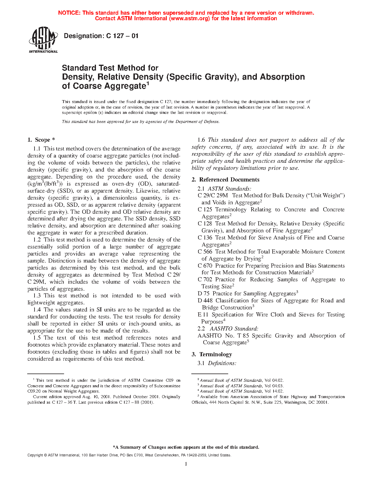 5.1 Relative density (specific gravity) is the ratio of mass of an aggregate to the mass of a volume of water equal to the volume of the aggregate particles – also referred to as the absolute volume of the aggregate. It is also expressed as the ratio of the density of the aggregate particles to the density of water. Distinction is made between the density of aggregate particles and the bulk density of aggregates as determined by Test Method C29/C29M, which includes the volume of voids between the particles of aggregates.
