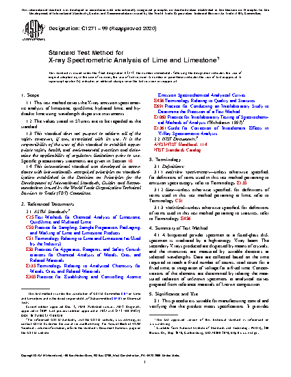 1.1 This test method covers the X-ray emission spectrometric analysis of limestone, quicklime, hydrated lime, and hydraulic lime using wavelength dispersive instruments.