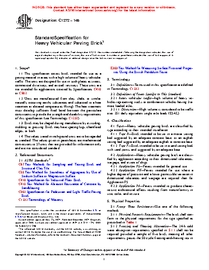 1.1 This specification covers brick intended for use as a paving material in areas with a high volume of heavy vehicular traffic. The units are designed for use in such places as streets, commercial driveways, and aircraft taxiways. These units are not intended for applications covered by Specifications C410 or C902.