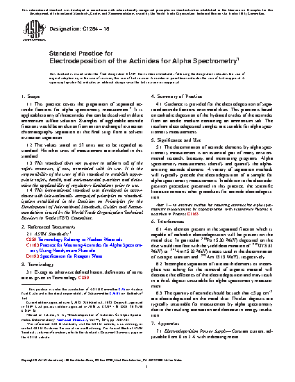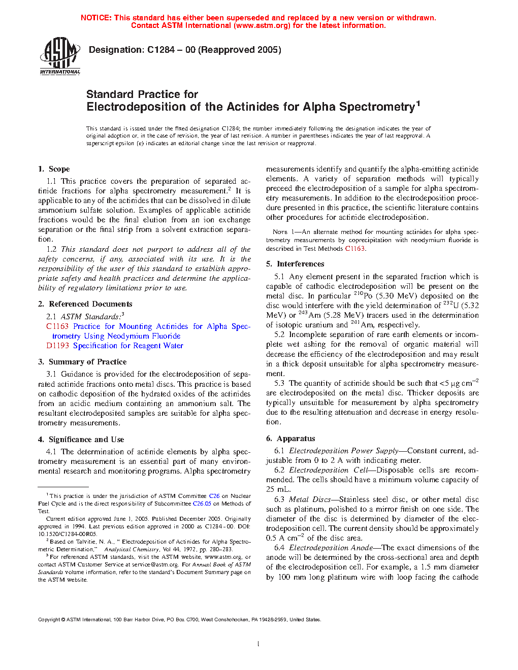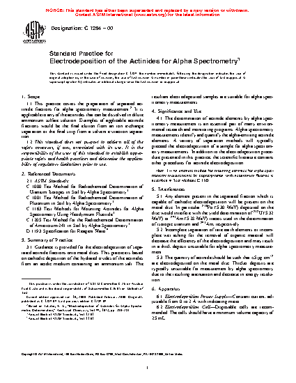 5.1 The determination of actinide elements by alpha spectrometry measurement is an essential part of many environmental research, bioassay, and monitoring programs. Alpha spectrometry measurements identify and quantify the alpha-emitting actinide elements. A variety of separation methods will typically precede the electrodeposition of a sample for alpha spectrometry measurements. In addition to the electrodeposition procedure presented in this practice, the scientific literature contains other procedures for actinide electrodeposition.