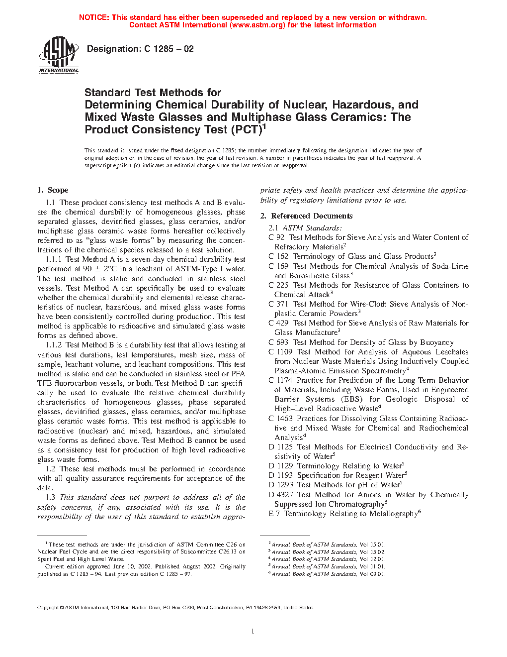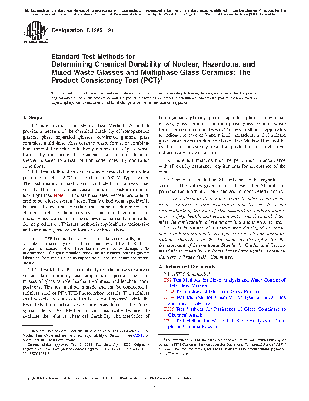 1.1 These product consistency test methods A and B evaluate the chemical durability of homogeneous glasses, phase separated glasses, devitrified glasses, glass ceramics, and/or multiphase glass ceramic waste forms hereafter collectively referred to as “glass waste forms” by measuring the concentrations of the chemical species released to a test solution.