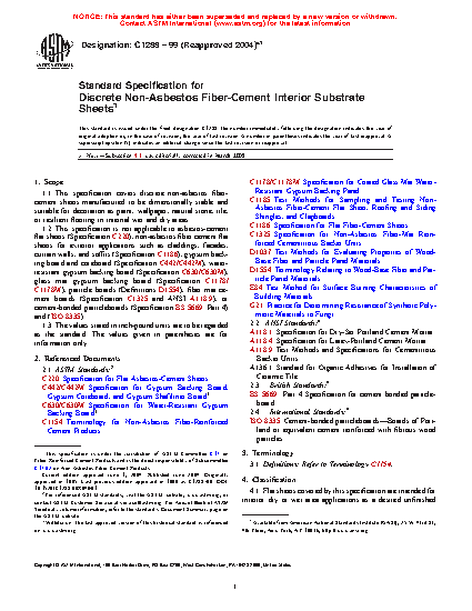 1.1 This specification covers discrete fiber-cement sheets manufactured to be dimensionally stable and suitable for decoration as paint, wallpaper, natural stone, tile, or resilient flooring in internal wet and dry areas.