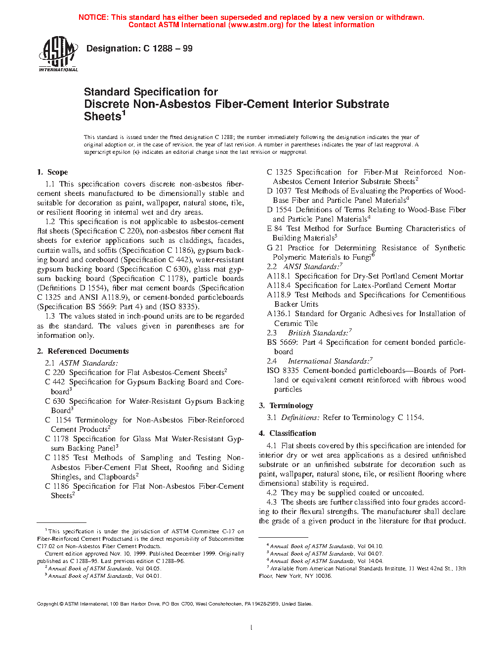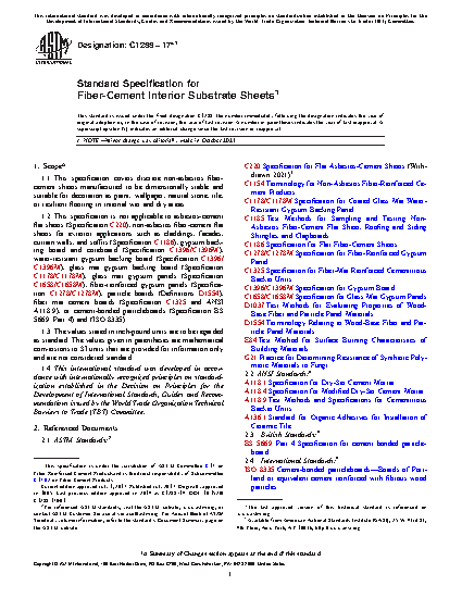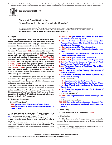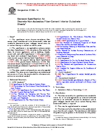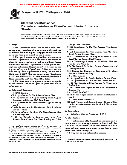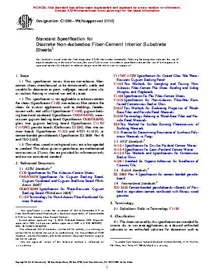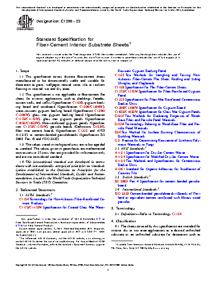 1.1 This specification covers discrete non-asbestos fiber-cement sheets manufactured to be dimensionally stable and suitable for decoration as paint, wallpaper, natural stone, tile, or resilient flooring in internal wet and dry areas.