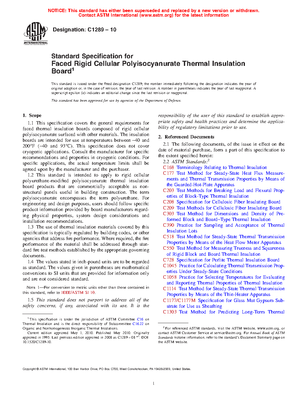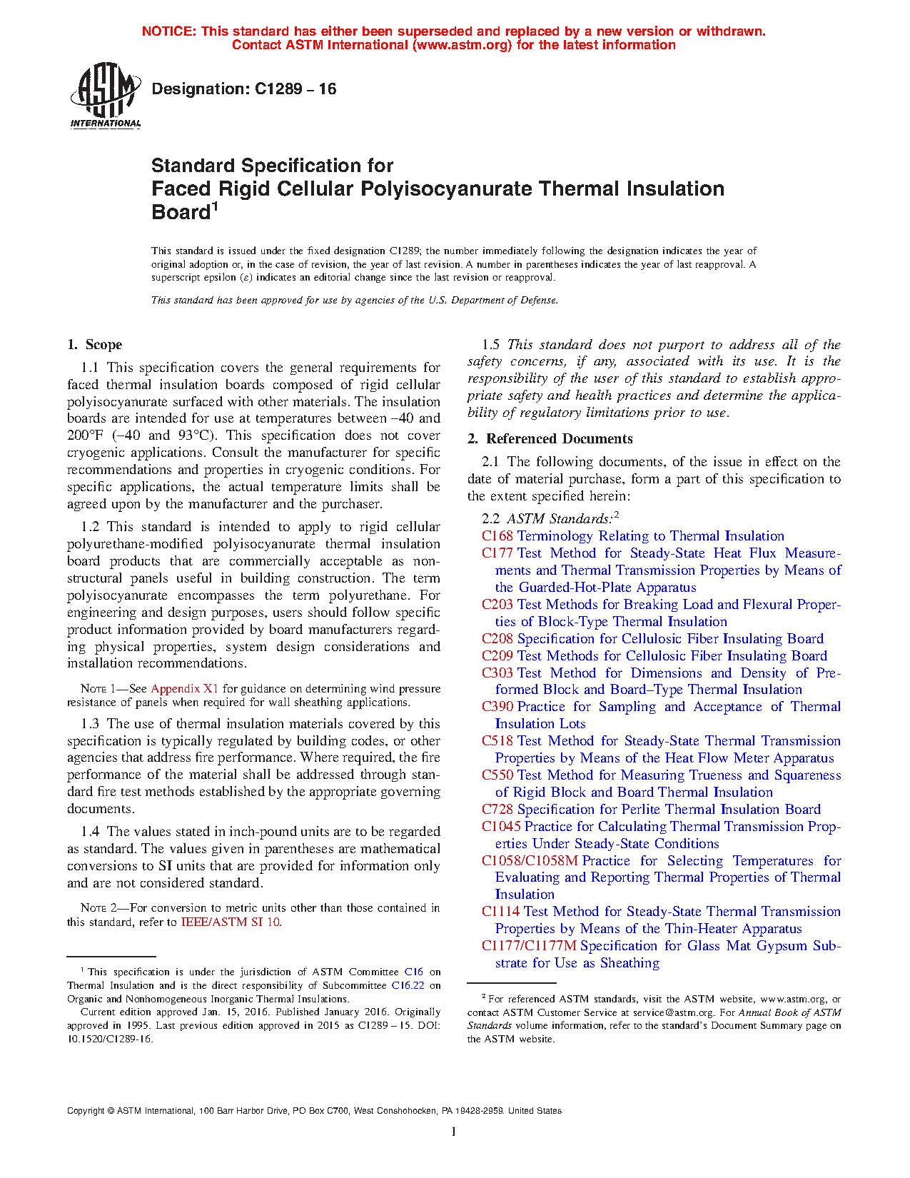 1.1 This specification covers the general requirements for faced thermal insulation boards composed of rigid cellular polyisocyanurate surfaced with other materials. The insulation boards are intended for use at temperatures between -40 and 200°F (-40 and 93°C). This specification does not cover cryogenic applications. Consult the manufacturer for specific recommendations and properties in cryogenic conditions. For specific applications, the actual temperature limits shall be agreed upon by the manufacturer and the purchaser.