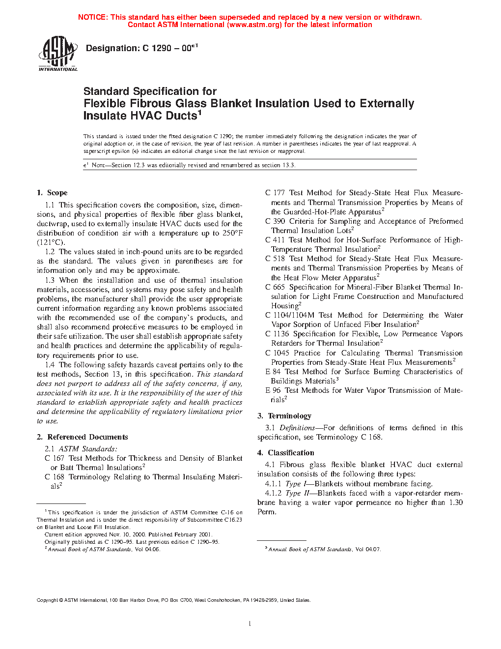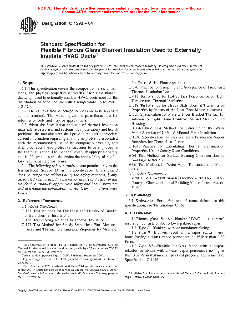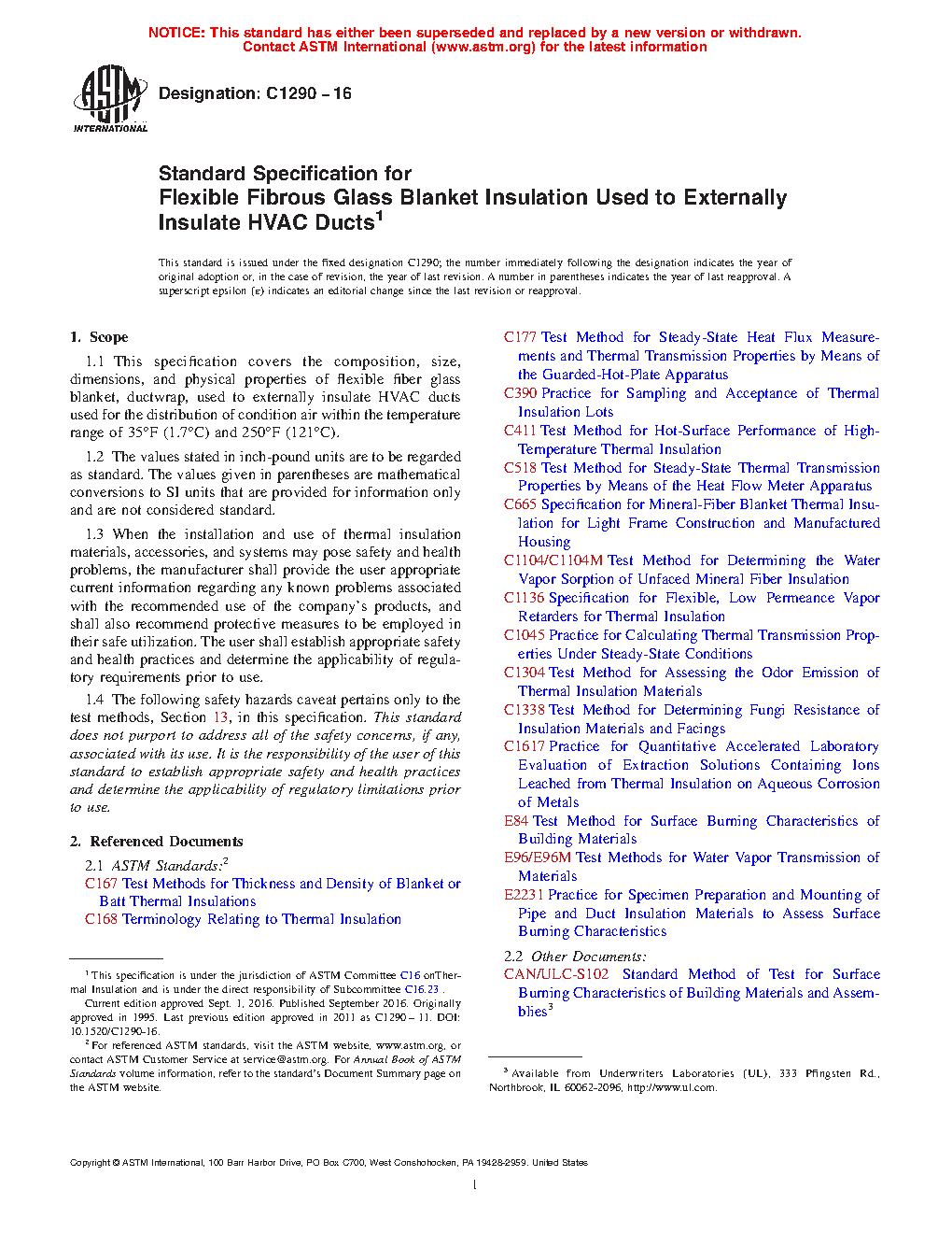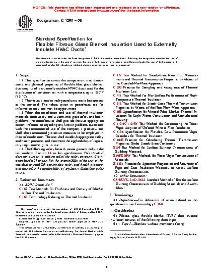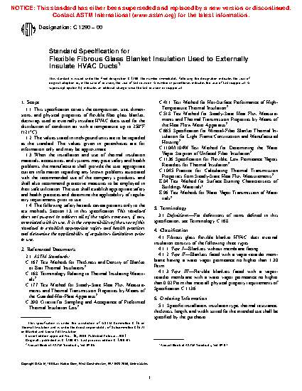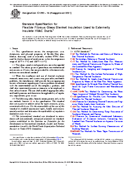 1.1 This specification covers the composition, size, dimensions, and physical properties of flexible fiber glass blanket, ductwrap, used to externally insulate HVAC ducts used for the distribution of condition air within the temperature range of 35°F (1.7°C) and 250°F (121°C).