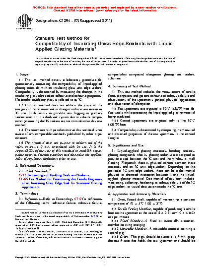 1.1 This test method covers a laboratory procedure for quantitatively measuring the compatibility of liquid-applied glazing materials with an insulating glass unit edge sealant. Compatibility is determined by measuring the changes in the insulating glass edge sealant adhesive and cohesive properties. Hereinafter insulating glass is referred to as IG.