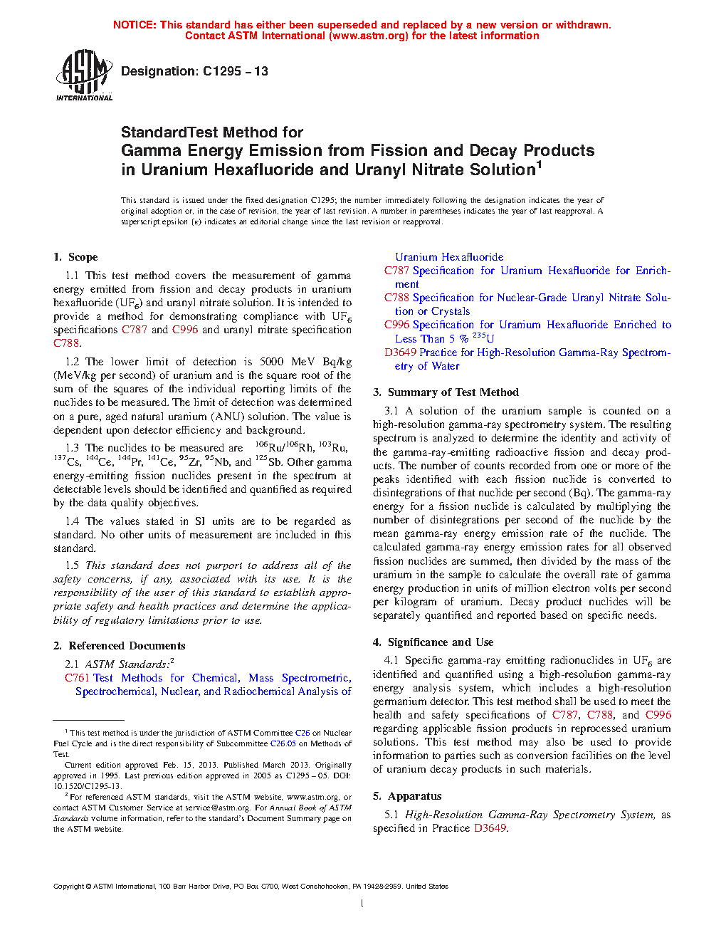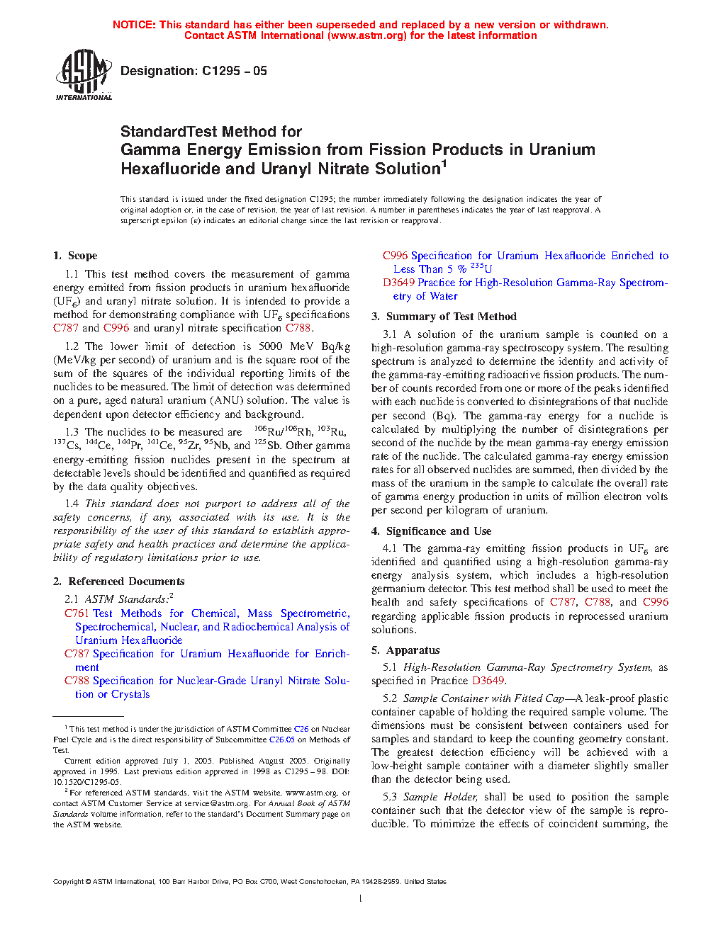 1.1 This test method covers the measurement of gamma energy emitted from fission products in uranium hexafluoride (UF6) and uranyl nitrate solution. This test method may also be used to measure the concentration of some uranium decay products. It is intended to provide a method for demonstrating compliance with UF6 specifications C787 and C996, uranyl nitrate specification C788, and uranium ore concentrate specification C967.
