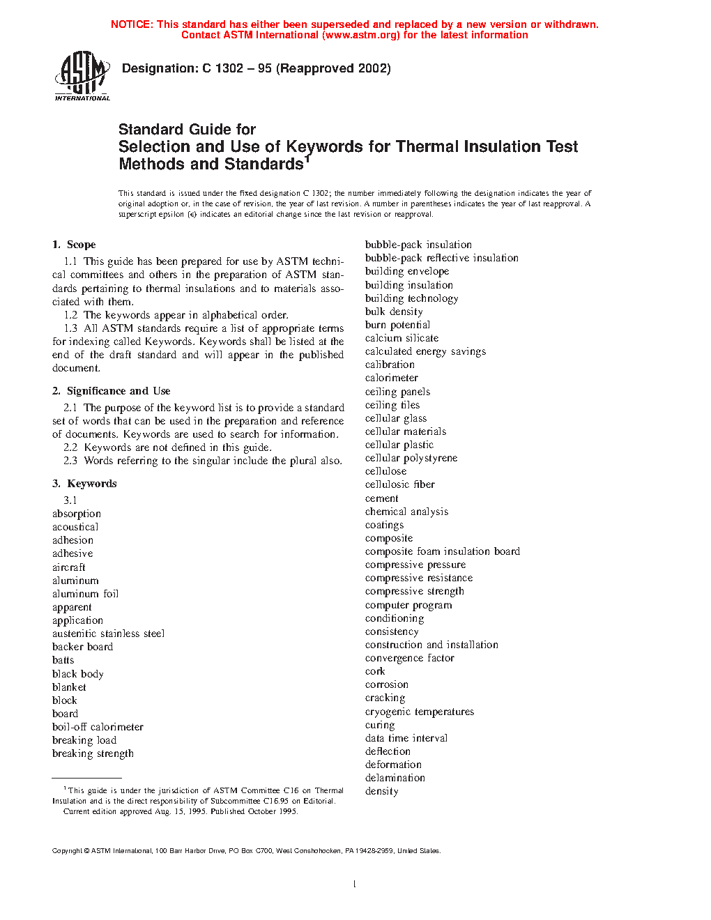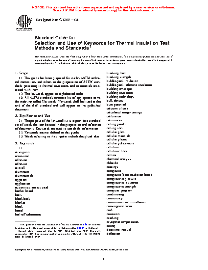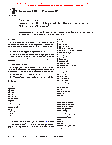 Standard Guide for Selection and Use of Keywords for Thermal Insulation Test Methods and Standards (Withdrawn 2017)