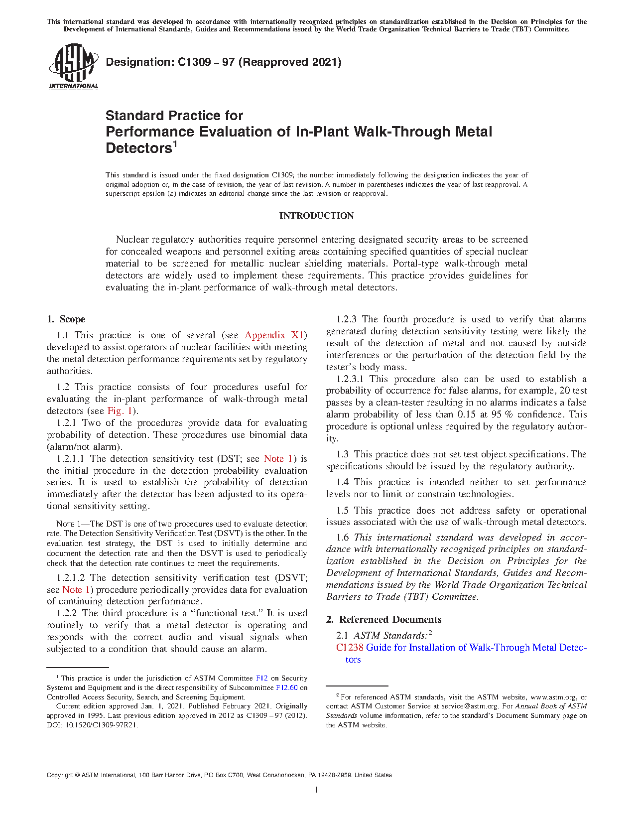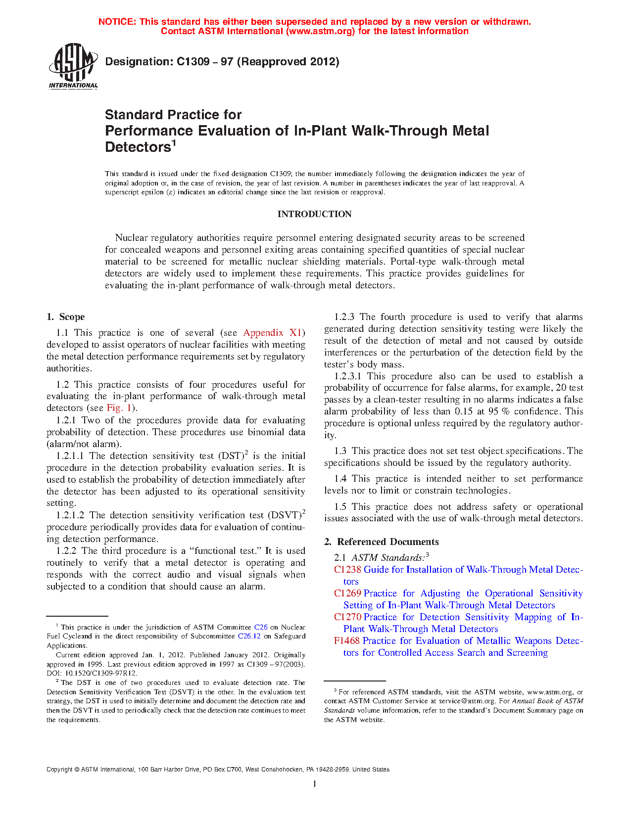 1.1 This practice is one of several (see Appendix X1) developed to assist operators of nuclear facilities with meeting the metal detection performance requirements set by regulatory authorities.