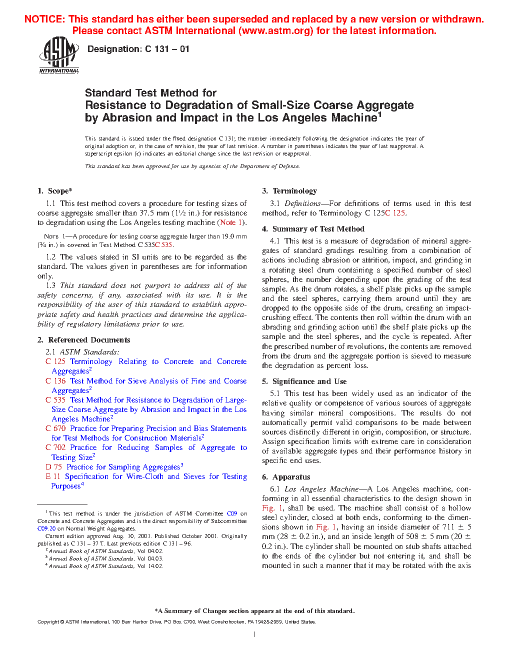 1.1 This test method covers a procedure for testing sizes of coarse aggregate smaller than 37.5 mm (11/ 2 in.) for resistance to degradation using the Los Angeles testing machine (Note 1).