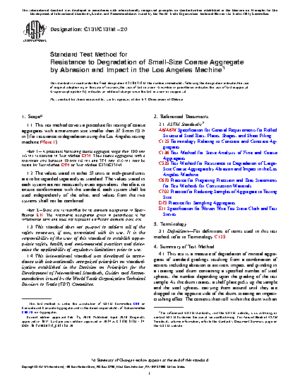 1.1 This test method covers a procedure for testing of coarse aggregates with a maximum size smaller than 37.5 mm ([11/2 in.] for resistance to degradation using the Los Angeles testing machine (Note 1).