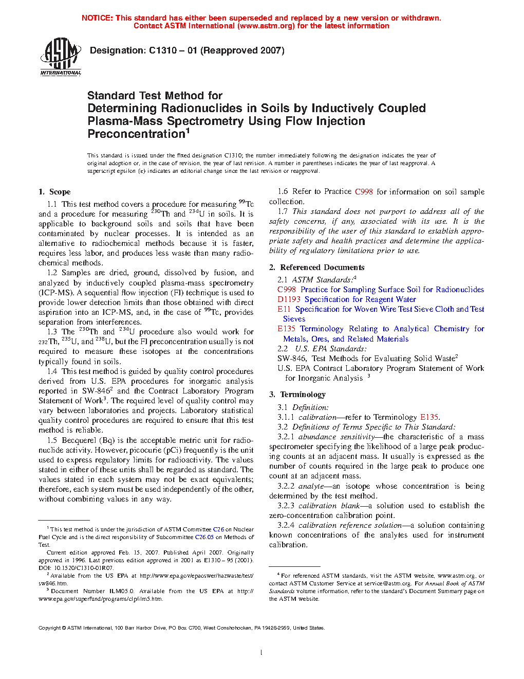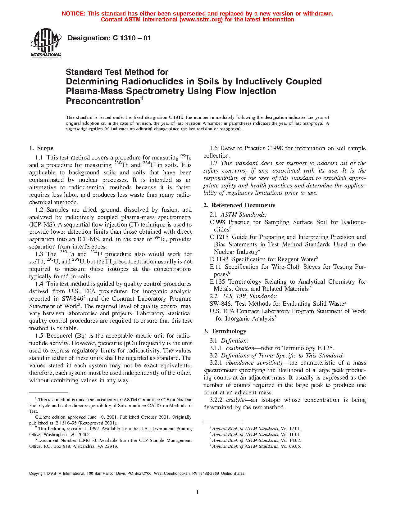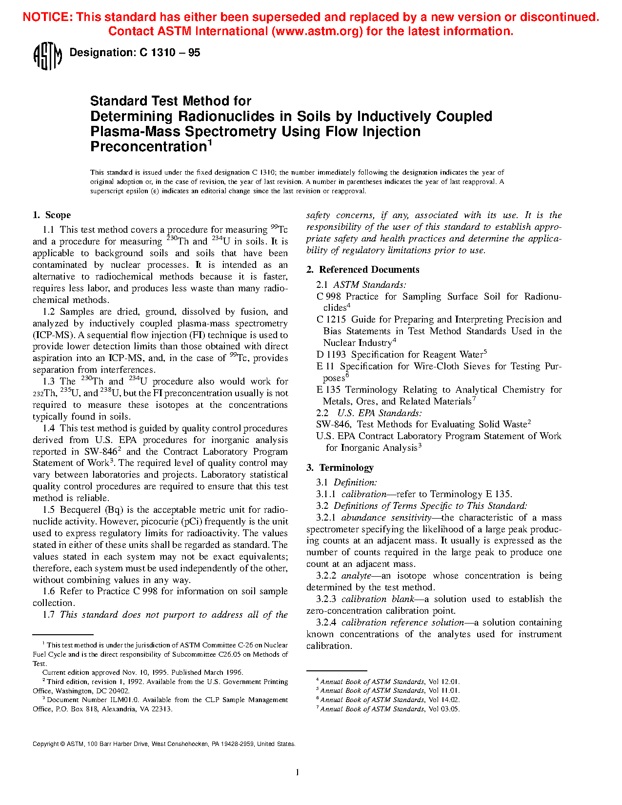 The test methods in this standard may be used to measure the concentrations of 99Tc, 230Th, and 234U in soil samples. The test methods are applicable to soils that have been contaminated by nuclear-related activities such as uranium ore processing and uranium enrichment. The FI concentration step reduces detection limits by approximately a factor of ten compared to ICP-MS with conventional sample introduction. Approximate IDLs are listed in Table 1.
