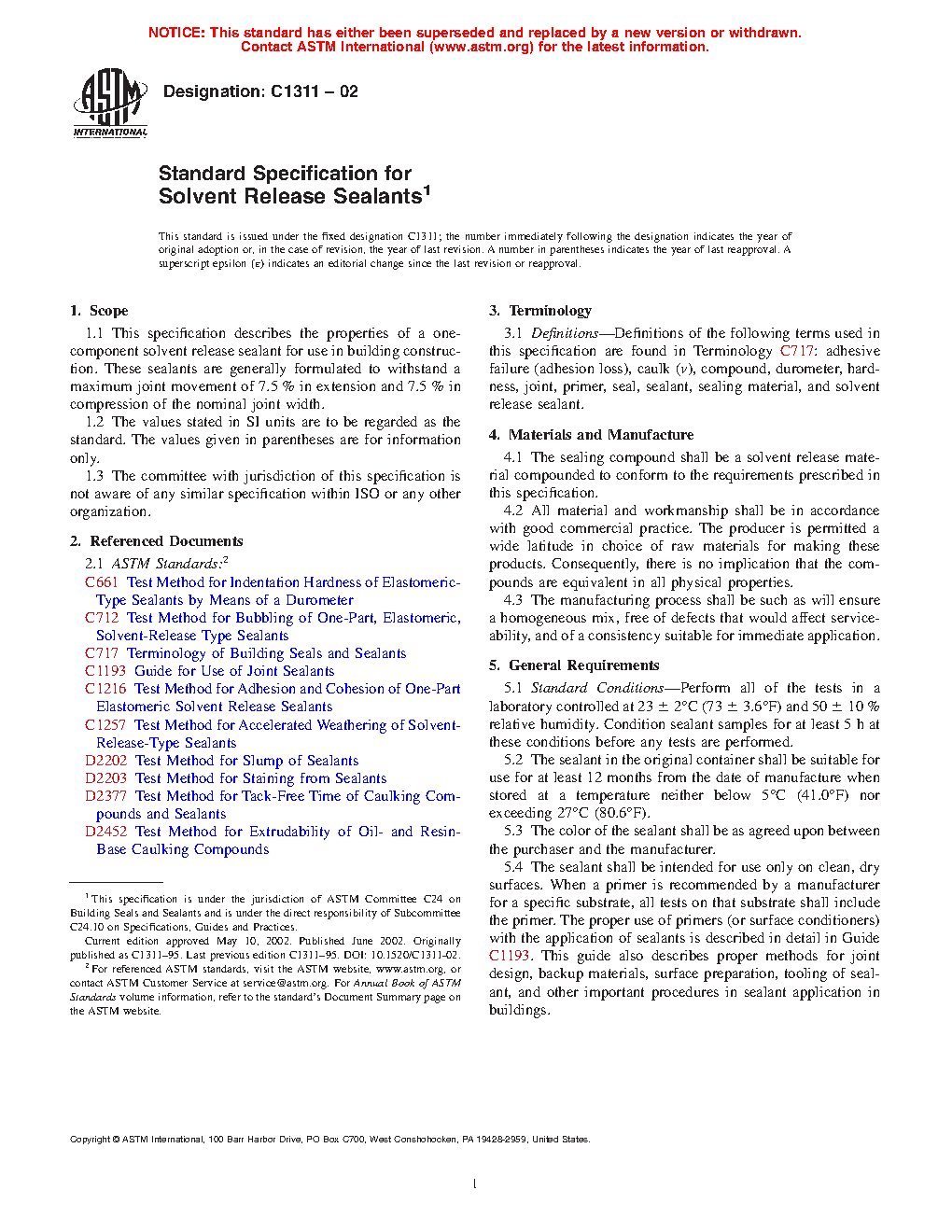 1.1 This specification describes the properties of a one-component solvent release sealant for use in building construction. These sealants are generally formulated to withstand a maximum joint movement of 7.5 % in extension and 7.5 % in compression of the nominal joint width.