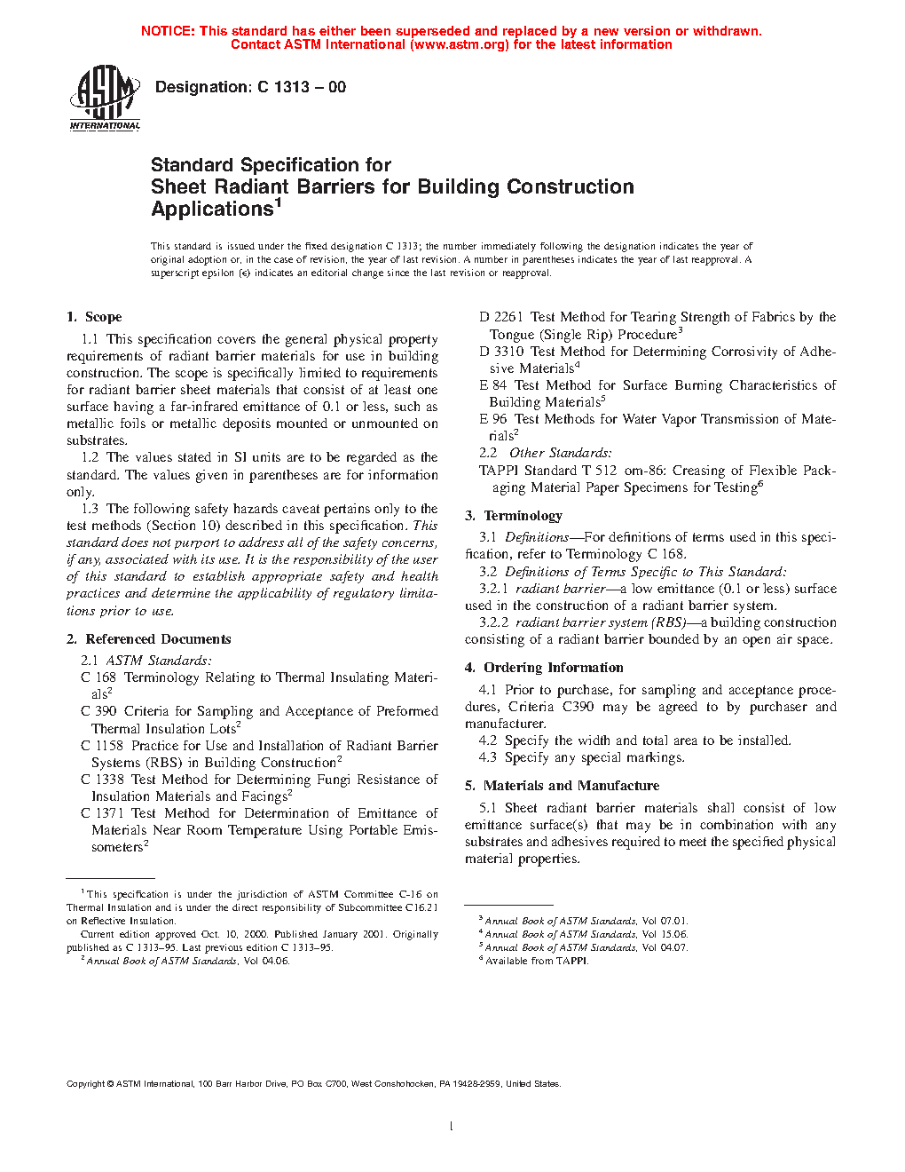 This specification covers the general physical property requirements of radiant barrier materials for use in building construction. The scope is specifically limited to requirements for radiant barrier sheet materials that consist of at least one surface, such as metallic foils or metallic deposits mounted or unmounted on substrates. Sheet radiant barrier materials shall consist of low emittance surface(s) that may be in combination with any substrates and adhesives required to meet the specified physical material properties. The following test methods shall be performed: surface emittance; water vapor transmission; surface burning characteristics; corrosivity; tear resistance; and adhesive performance.