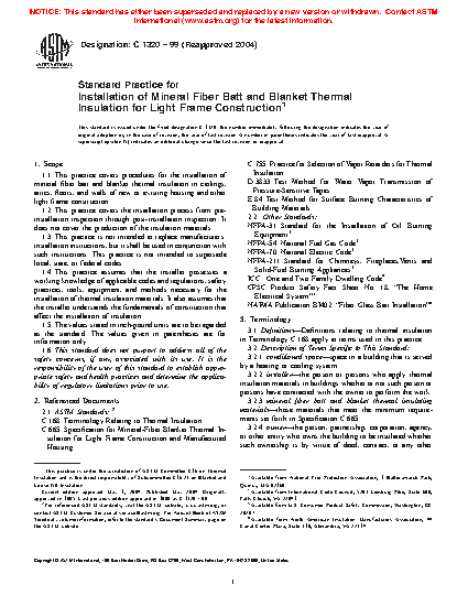1.1 This practice covers procedures for the installation of mineral fiber batt and blanket thermal insulation in ceilings, attics, floors, and walls of new or existing housing and other light frame construction.