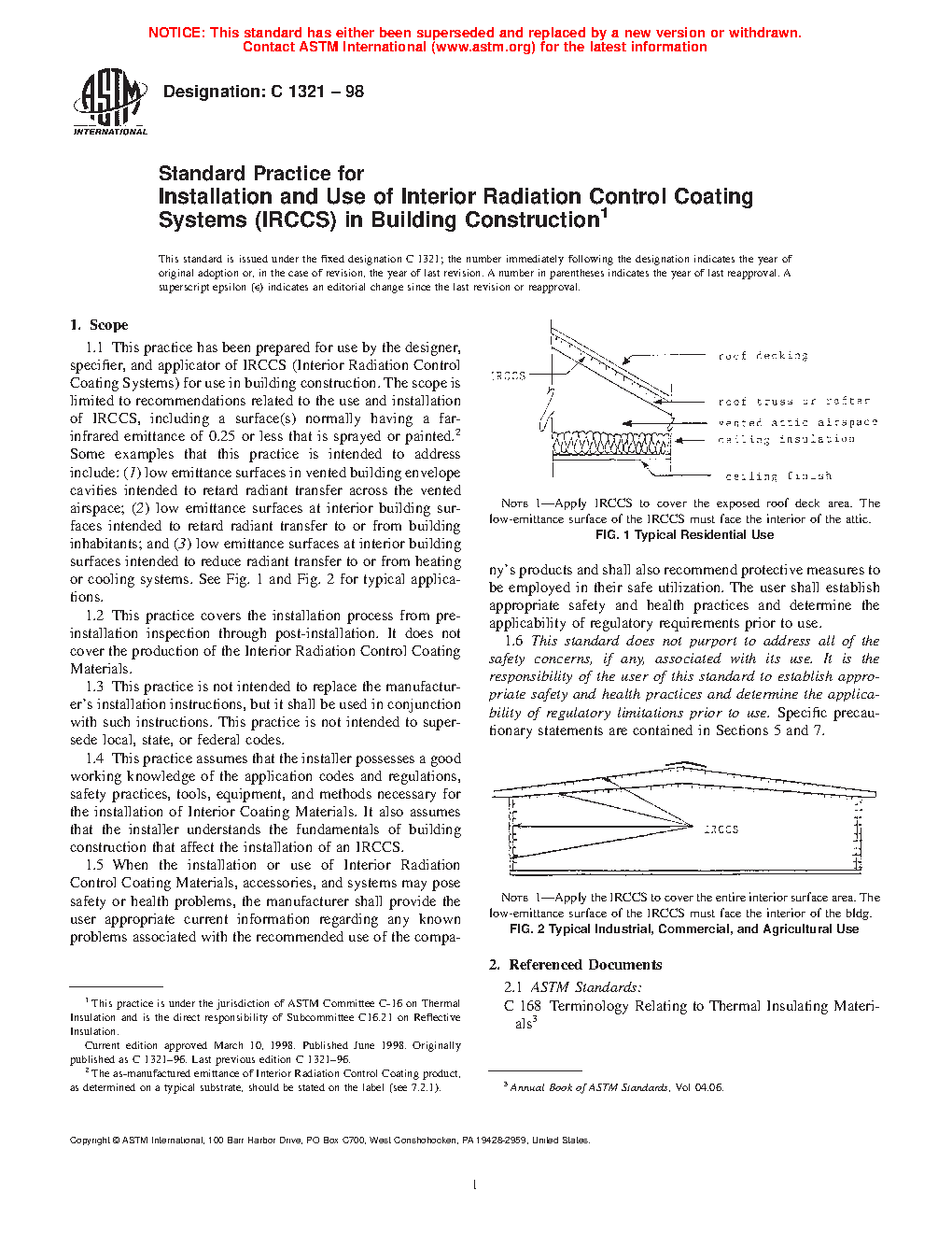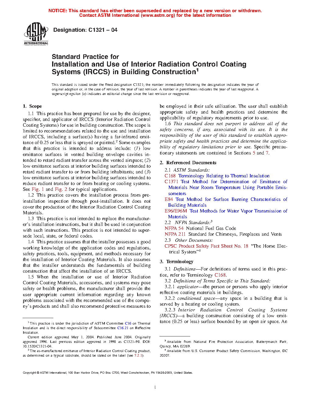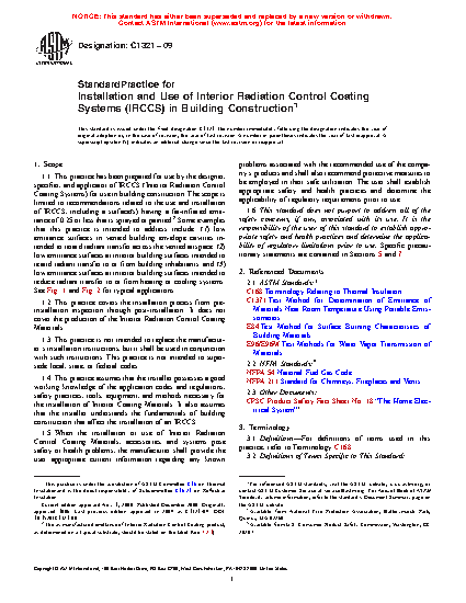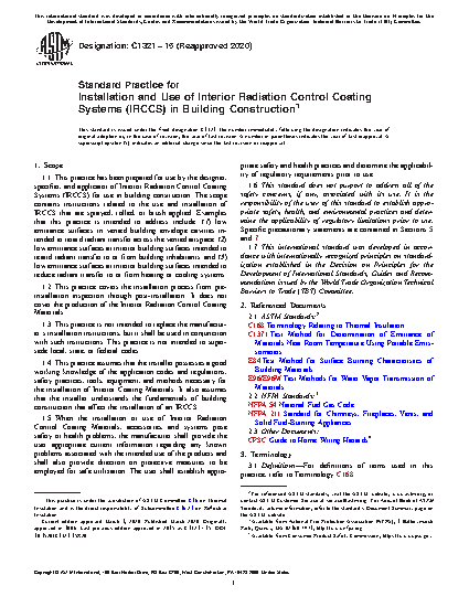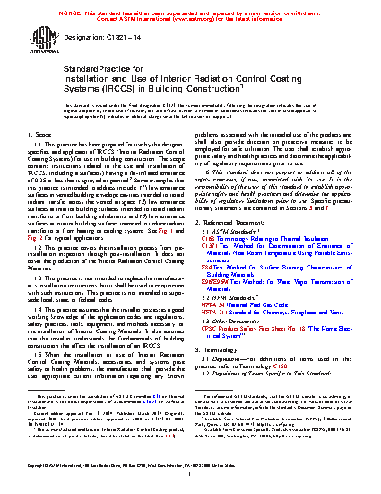 1.1 This practice has been prepared for use by the designer, specifier, and applicator of Interior Radiation Control Coating Systems (IRCCS) for use in building construction. The scope contains instructions related to the use and installation of IRCCS that are sprayed, rolled, or brush applied. Examples that this practice is intended to address include: (1) low emittance surfaces in vented building envelope cavities intended to retard radiant transfer across the vented airspace; (2) low emittance surfaces at interior building surfaces intended to retard radiant transfer to or from building inhabitants; and (3) low emittance surfaces at interior building surfaces intended to reduce radiant transfer to or from heating or cooling systems.
