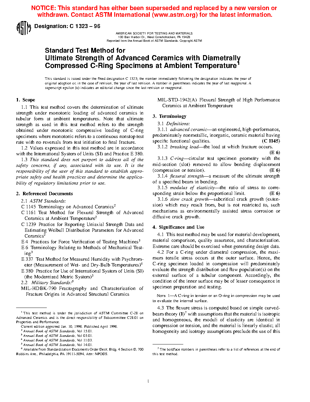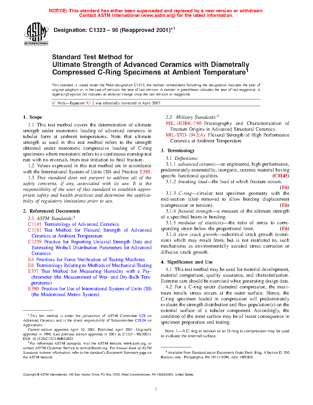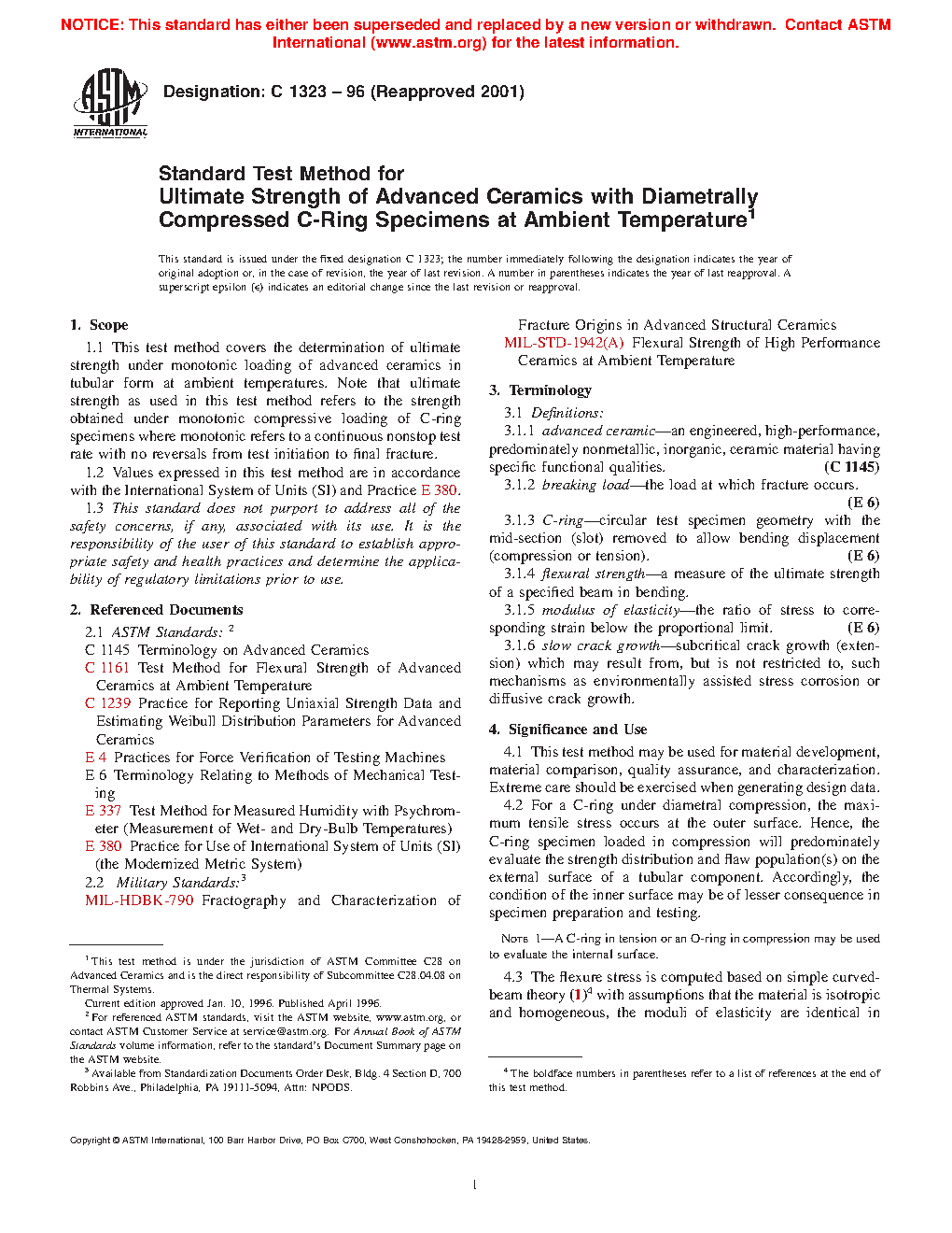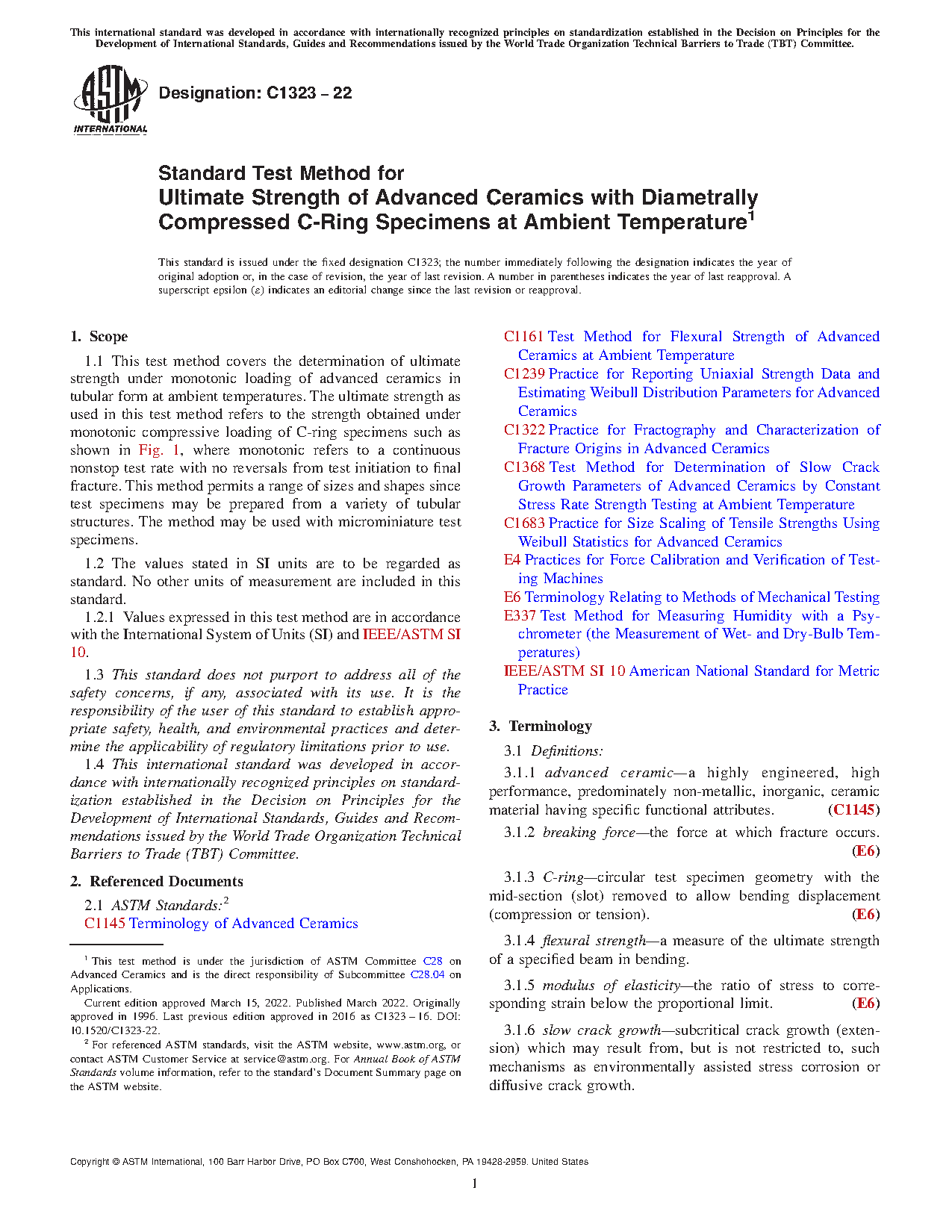 1.1 This test method covers the determination of ultimate strength under monotonic loading of advanced ceramics in tubular form at ambient temperatures. Note that ultimate strength as used in this test method refers to the strength obtained under monotonic compressive loading of C-ring specimens where monotonic refers to a continuous nonstop test rate with no reversals from test initiation to final fracture.