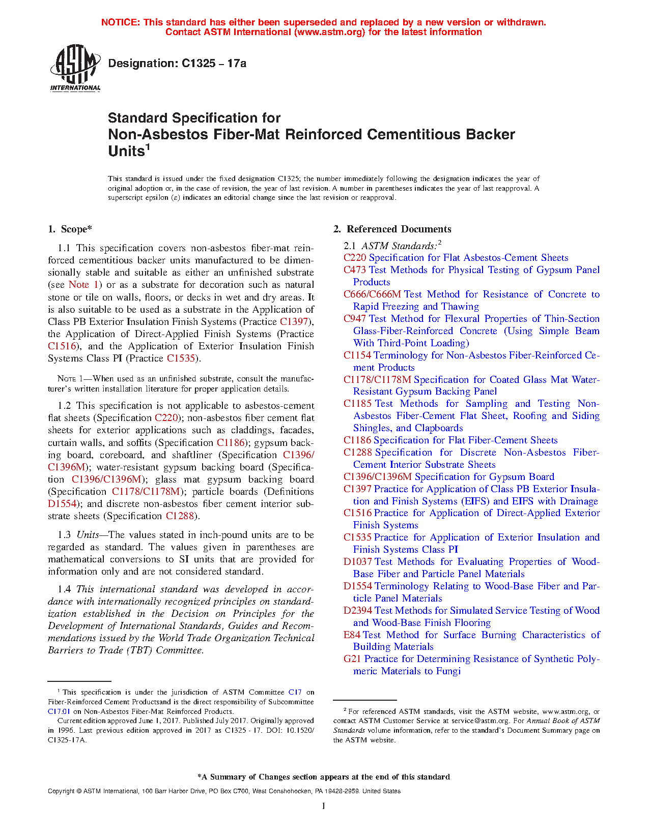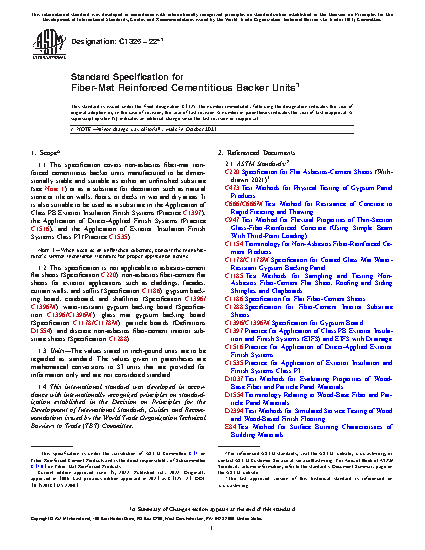 1.1 This specification covers non-asbestos fiber-mat reinforced cementitious backer units manufactured to be dimensionally stable and suitable as either an unfinished substrate (see Note 1) or as a substrate for decoration such as natural stone or tile on walls, floors, or decks in wet and dry areas. It is also suitable to be used as a substrate in the Application of Class PB Exterior Insulation Finish Systems (Practice C1397), the Application of Direct-Applied Finish Systems (Practice C1516), and the Application of Exterior Insulation Finish Systems Class PI (Practice C1535).