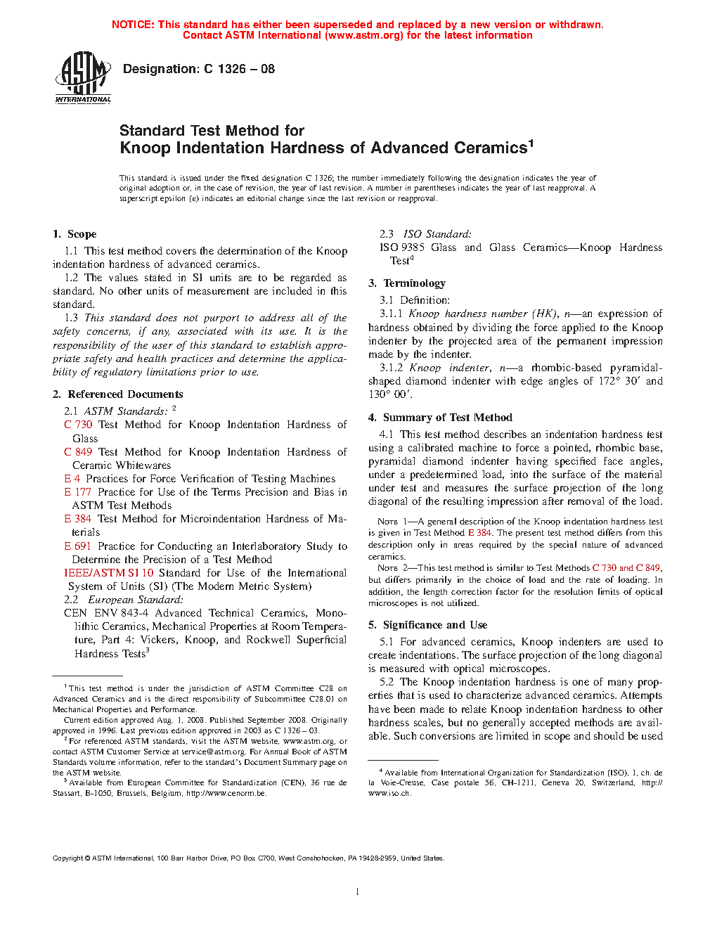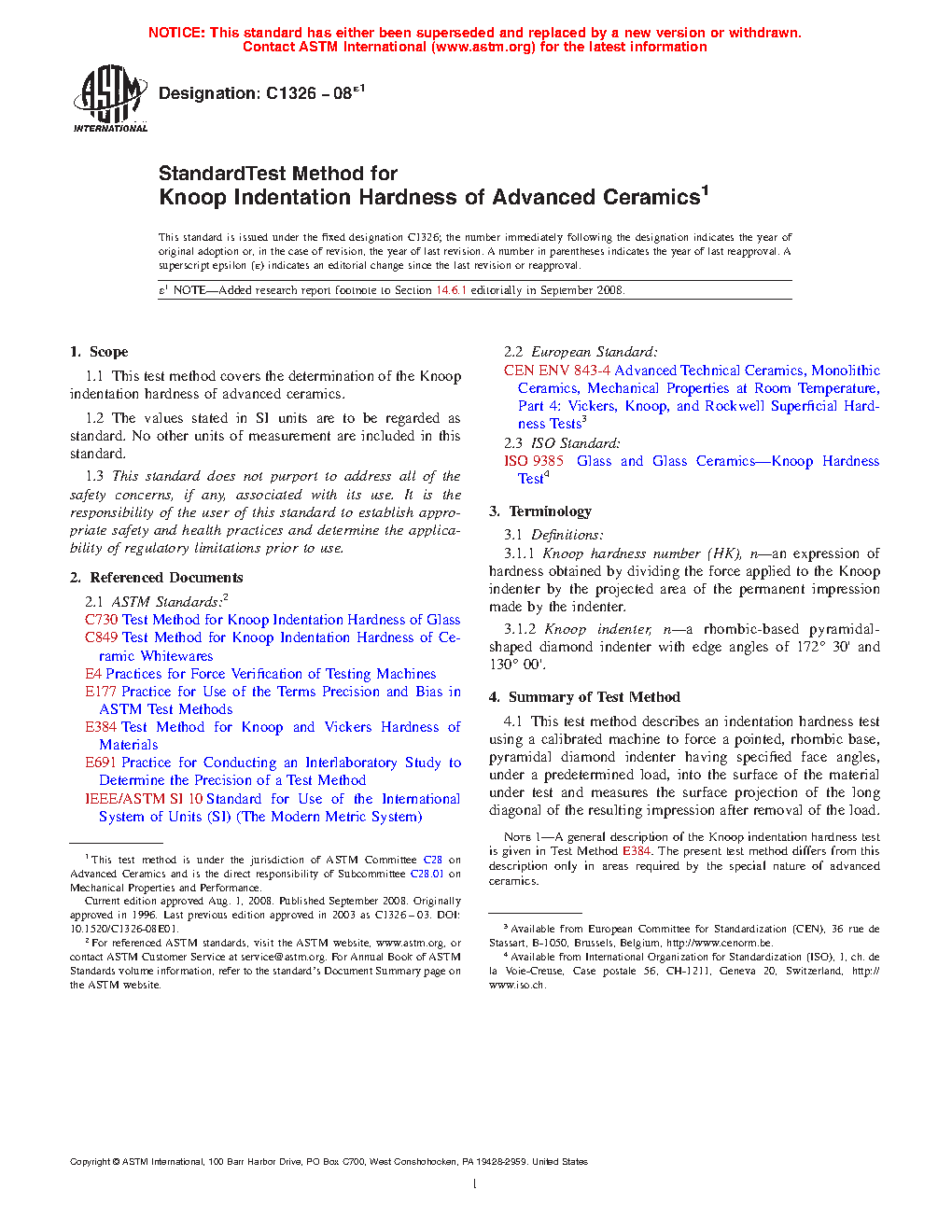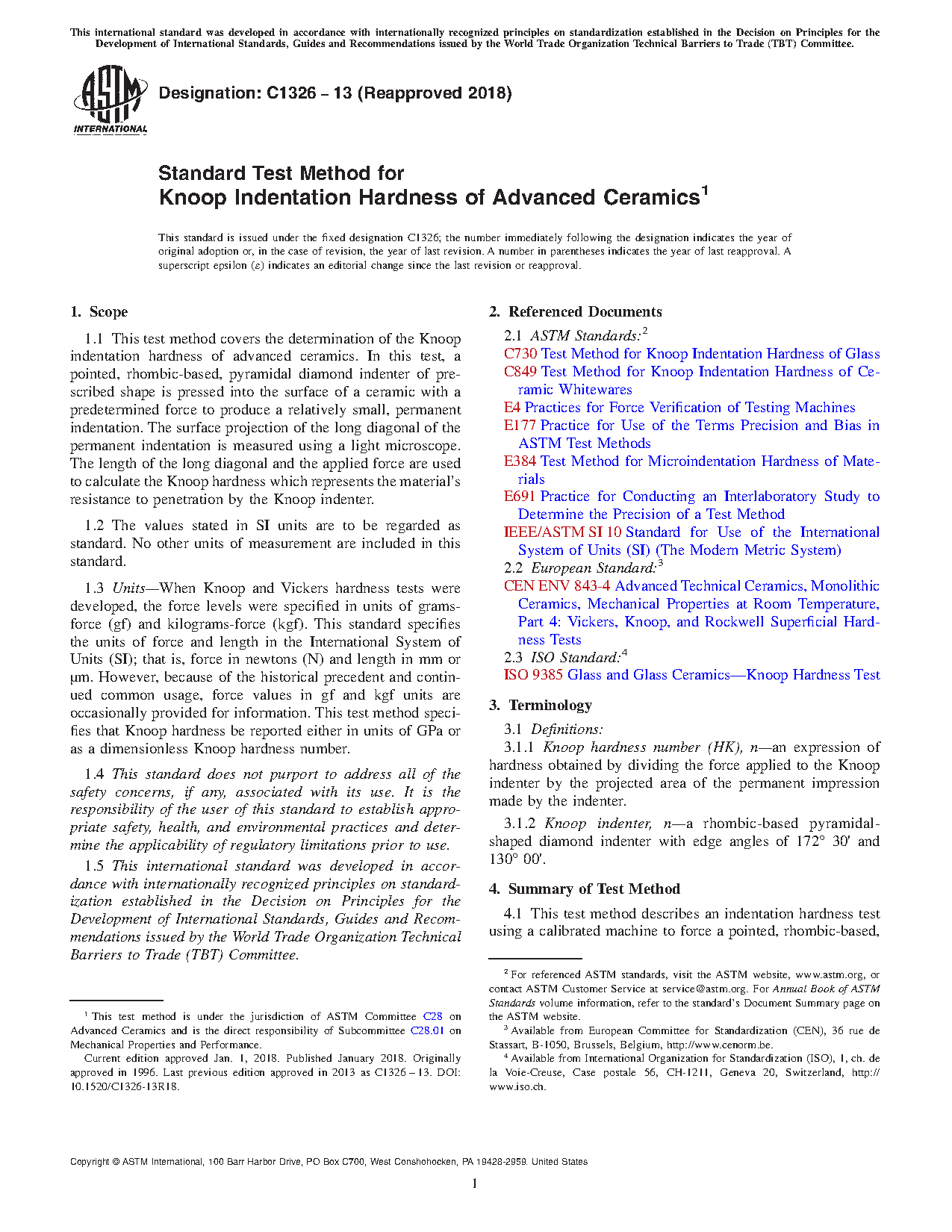 1.1 This test method covers the determination of the Knoop indentation hardness of advanced ceramics. In this test, a pointed, rhombic base, pyramidal diamond indenter of prescribed shape is pressed into the surface of a ceramic with a predetermined force to produce a relatively small, permanent indentation. The surface projection of the long diagonal of the permanent indentation is measured using a light microscope. The length of the long diagonal and the applied force are used to calculate the Knoop hardness which represents the material’s resistance to penetration by the Knoop indenter.
