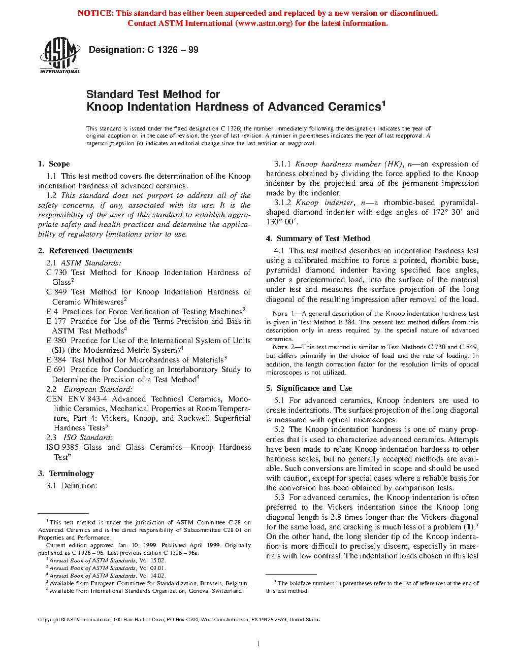 5.2 The Knoop indentation hardness is one of many properties that is used to characterize advanced ceramics. Attempts have been made to relate Knoop indentation hardness to other hardness scales, but no generally accepted methods are available. Such conversions are limited in scope and should be used with caution, except for special cases where a reliable basis for the conversion has been obtained by comparison tests.
