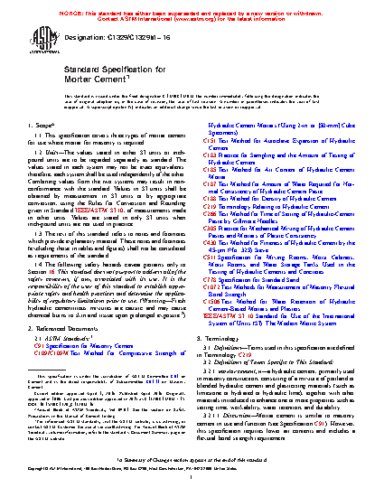 This specification covers three types of mortar cement for use where mortar for masonry is required. Mortar cements are classified as Type N, S, or M, according to the prescribed physical requirements. Mortar cement shall conform to the prescribed requirements such as fineness, autoclave expansion, time of setting, compressive strength, flexural bond strength, air content of mortar, and water retention. Test specimens shall undergo molding and storage before conducting the procedures in the required test methods.